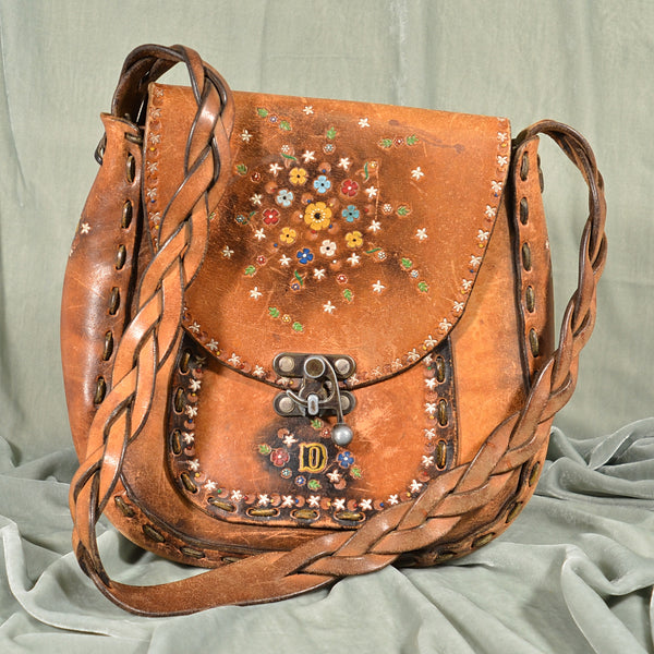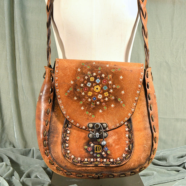 SOLD Vintage Tooled Leather Painted Handbag, OOAK Hippie Handmade Shoulder Bag, Monogrammed