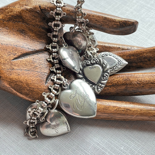 SOLD Vintage Sterling Charm Bracelet, Reversible Puffy Hearts, Etched Stamped Monogrammed