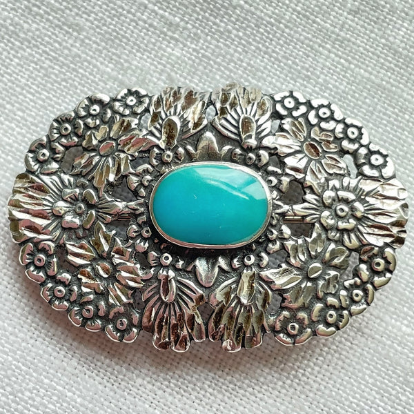 SOLD Vintage Sterling Silver Detailed Flower Turquoise Brooch/Pendant Signed CJ