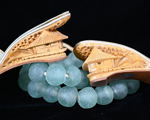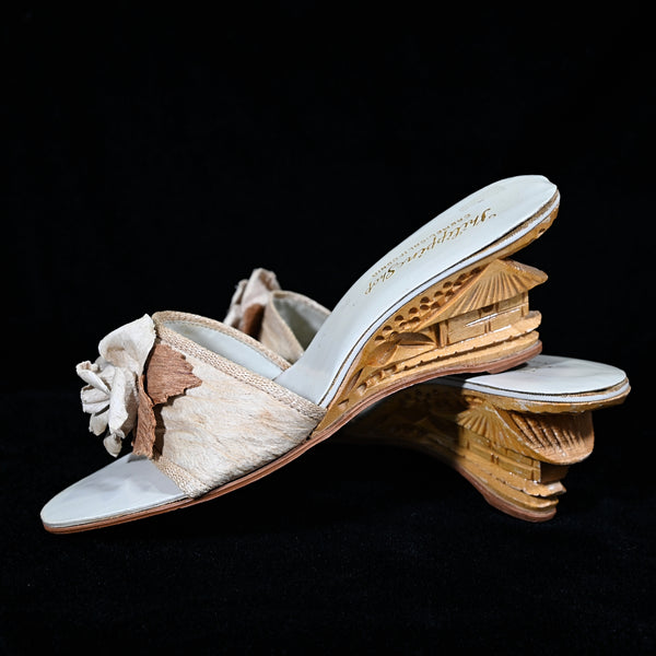 SOLD Vintage Tiki Carved Wood Wedge Slip on Mules