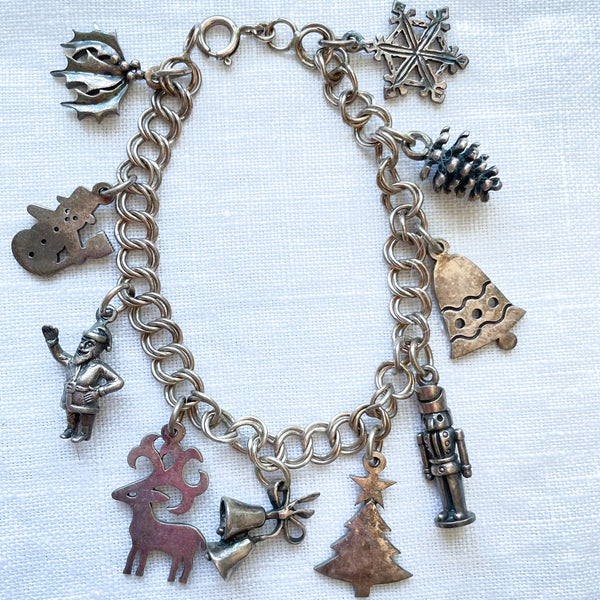 SOLD Vintage Sterling Silver Christmas Charm Bracelet, Santa + 10 Charms