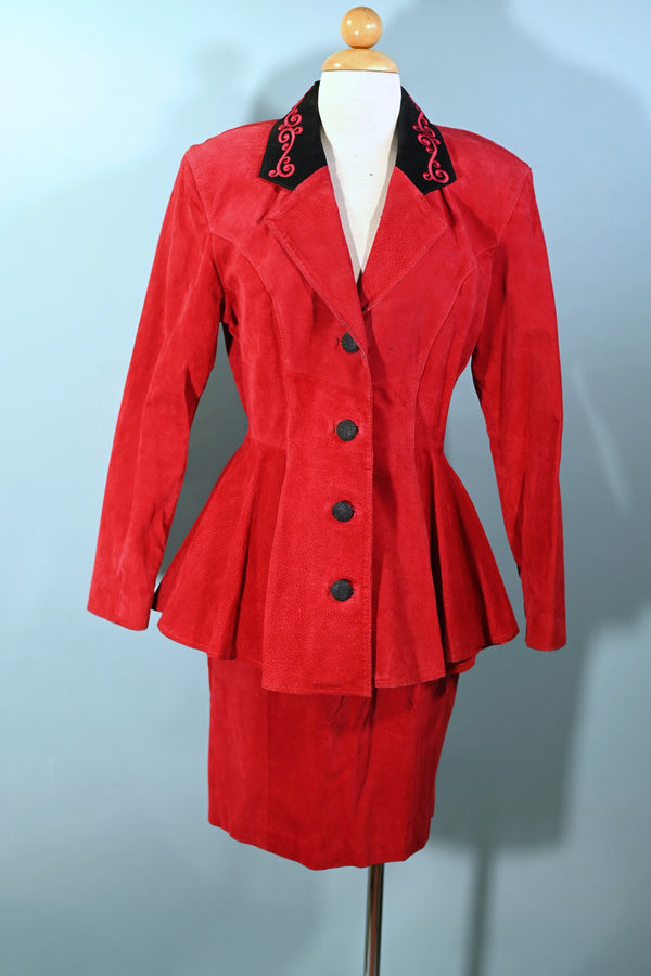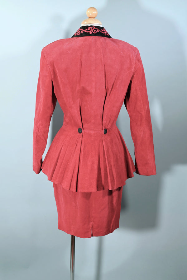 SOLD Chia Vintage 80s Does 40s Red Suede Peplum Jacket/Skirt Suit, 2 Piece Set Fits S
