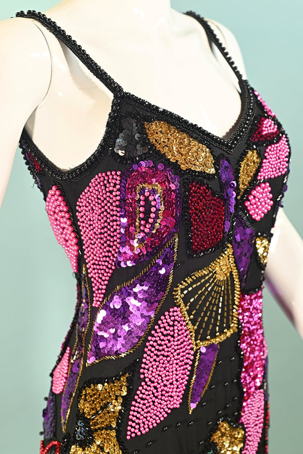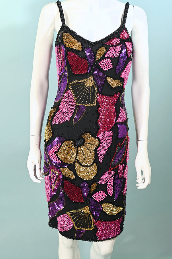 SOLD Alyce Designs Black Silk Beaded/Sequin Dress, Abstract Pattern S
