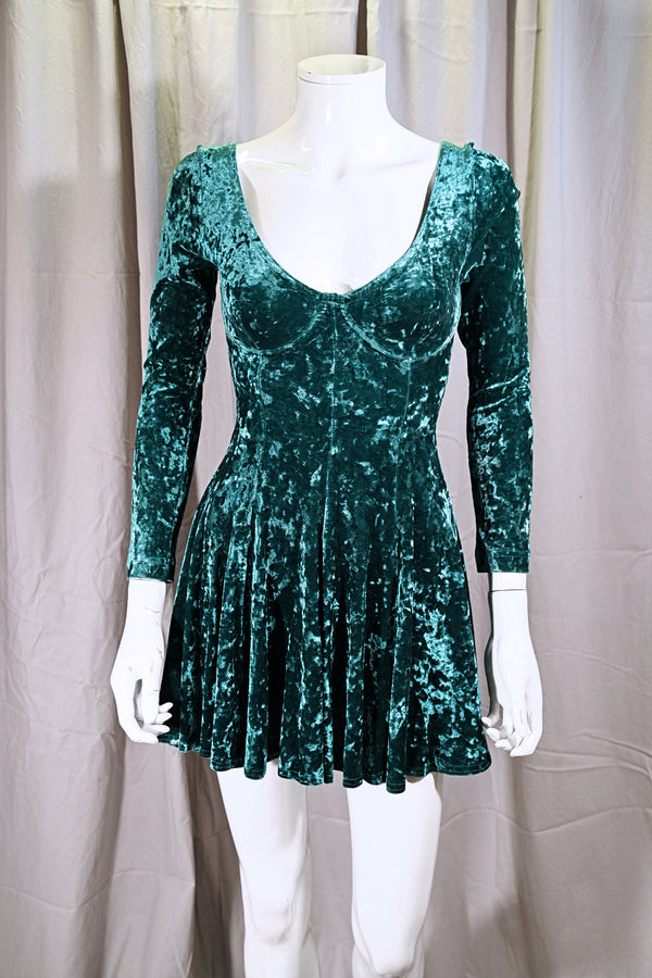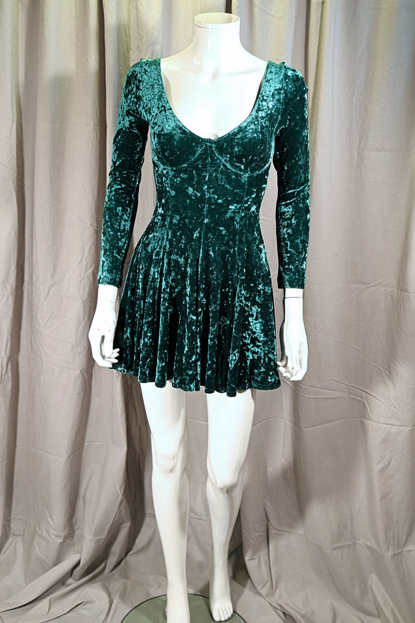 SOLD 90s Contempo Casuals Green Crushed Velvet Mini Dress, Bra Top Flare Skirt XS/S