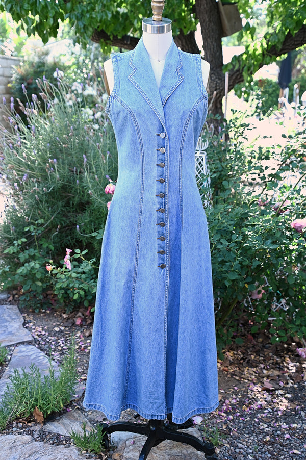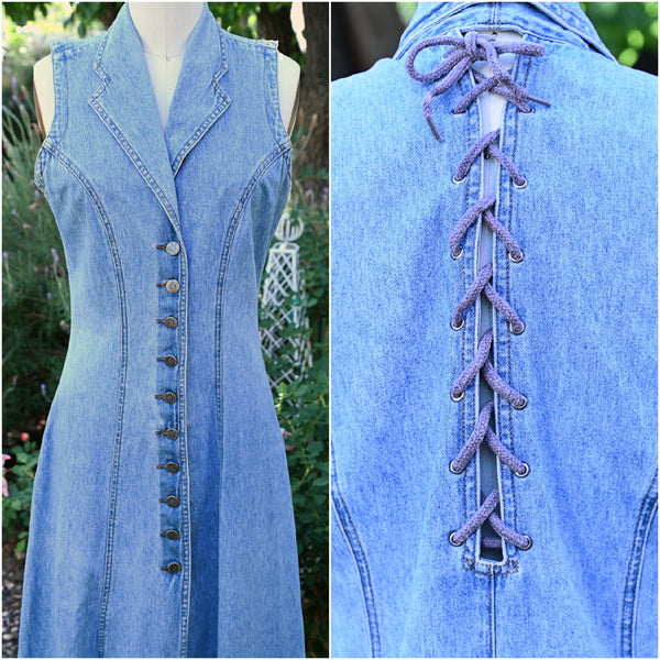 SOLD 90s Denim Dress Corset Lace Up Back, Y2K Boho Hippie Long Festival Dress M