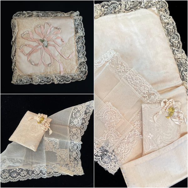 SOLD Antique Wedding Ring Pillow With Handkerchief & Sachet, 1920s Bridal Collection, Ribbon Lace Wedding Memento, Prop Costume Display
