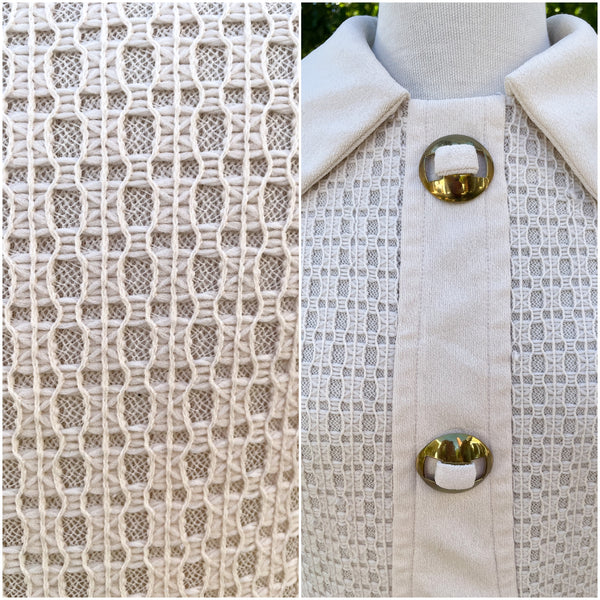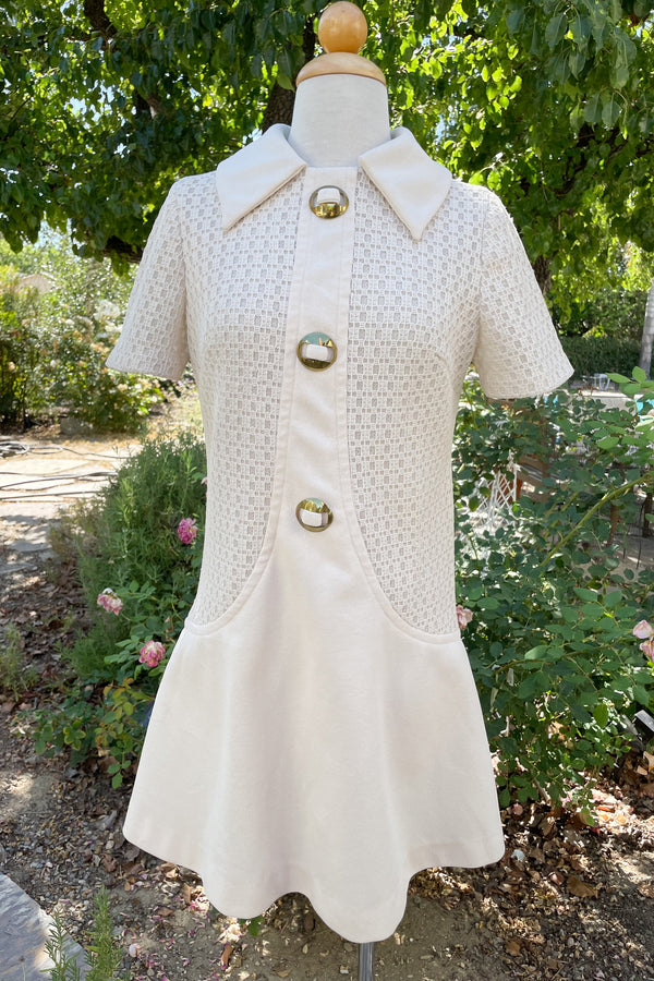 SOLD Angelique 60s Mod Mini Dress, 70s Off-White Flare Skirt Dress S
