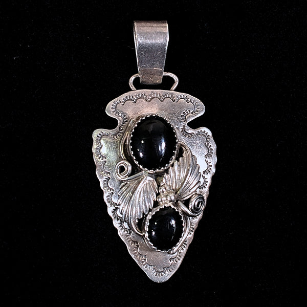 Vintage Navajo Sterling Silver Onyx Arrowhead Pendant, Swirls +Leaf Details, Signed A 10.9 Grams