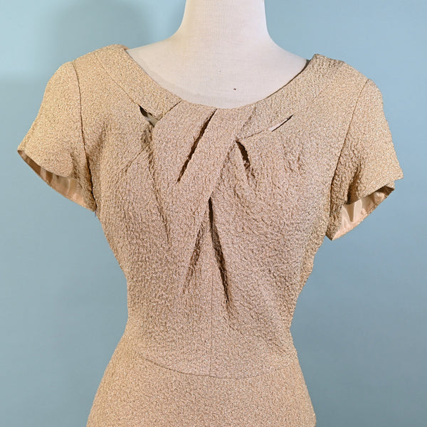 SOLD Vintage 50s Beige/Gold Lurex Fitted Cocktail Eveningwear Dress 32" Waist