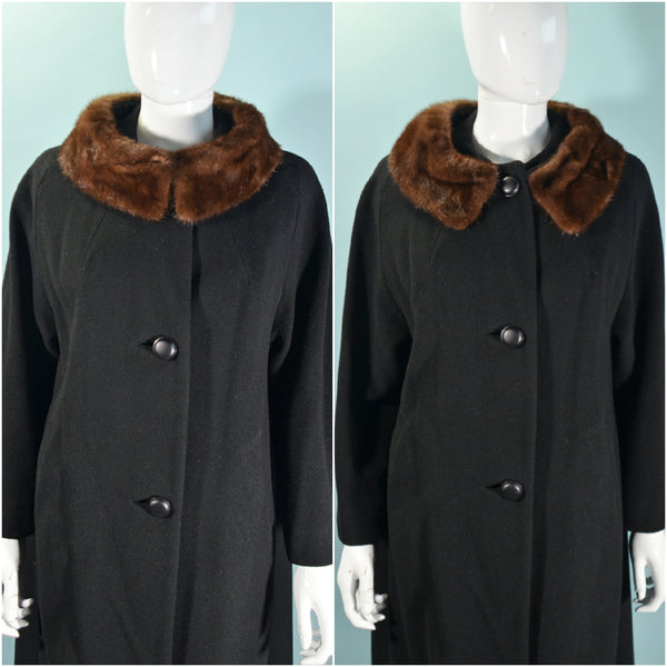 SOLD Vintage 50s/60s Black Wool Coat, Mink Collar Swing Coat