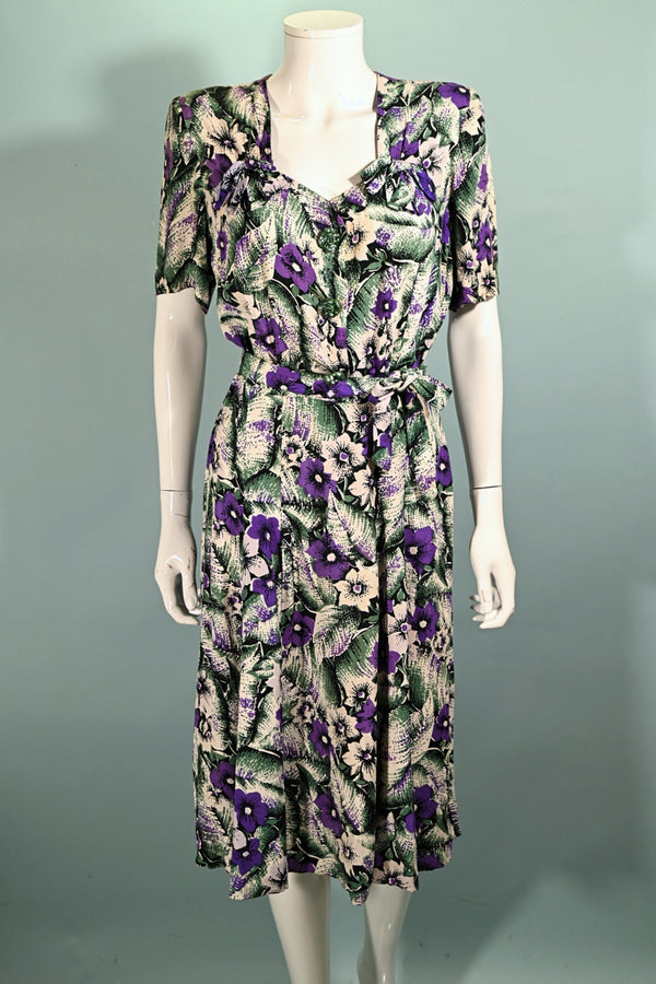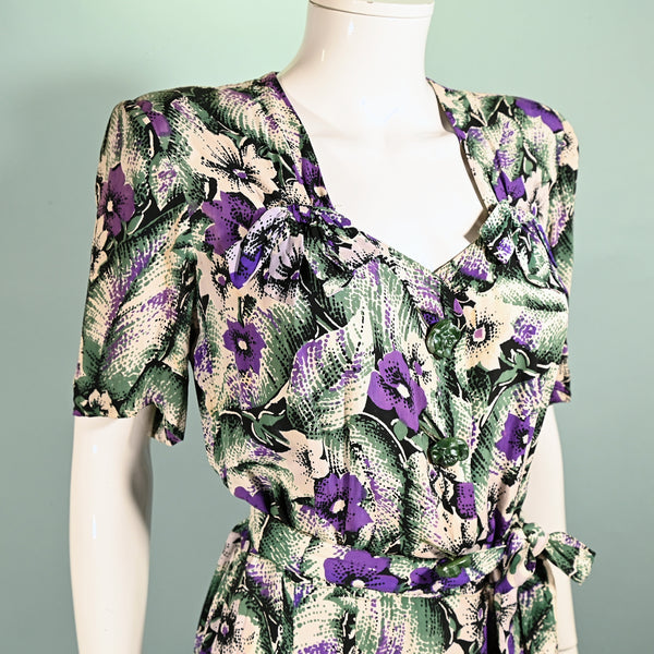 SOLD Vintage 40s Rayon Tropical Print Dress w/Flaws M