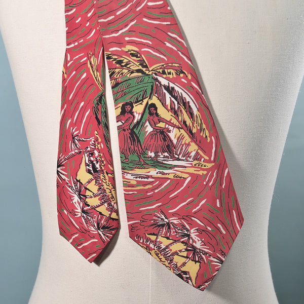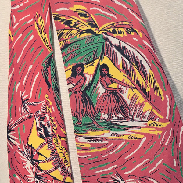 SOLD Vintage 40s/50s Hawaiian Print Mens Necktie, Hula Girls Palm Trees, Some Damage