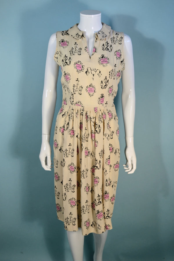 SOLD Vintage 50s Silk Novelty Print Paris Theme Sleeveless Dress S