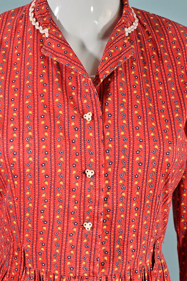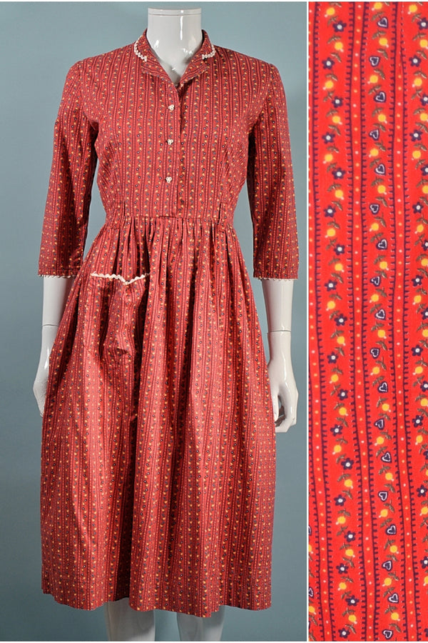 SOLD Vintage 50s Red Calico Print Cottagecore Farmcore Dress M