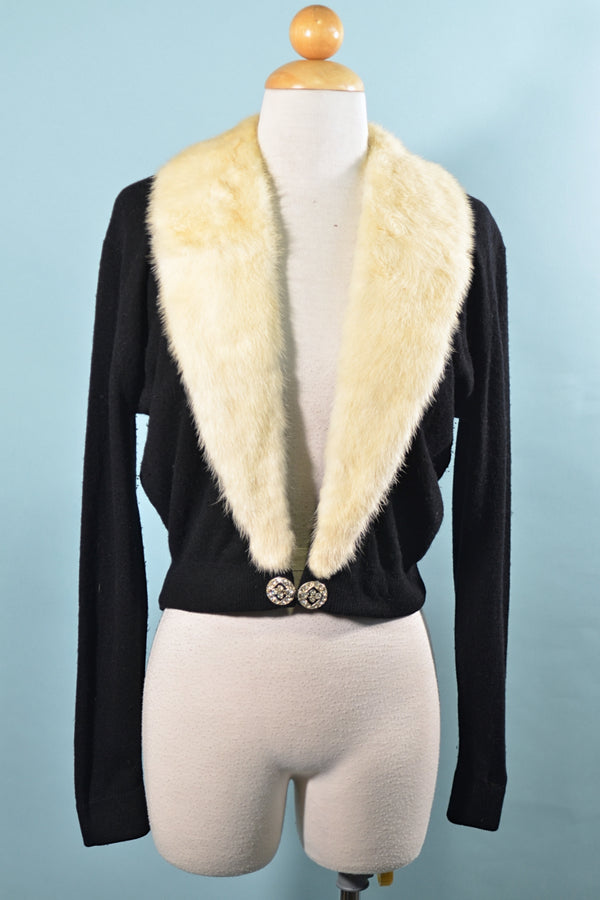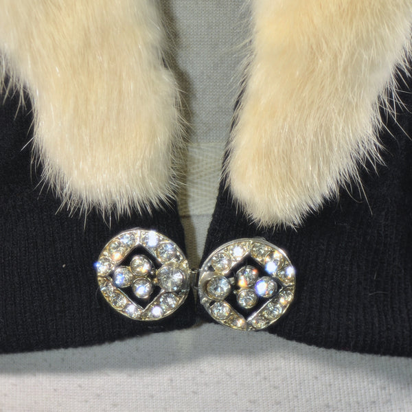 SOLD Vintage 50s Black Cashmere Cardigan White Mink Collar, Rhinestone Clasp
