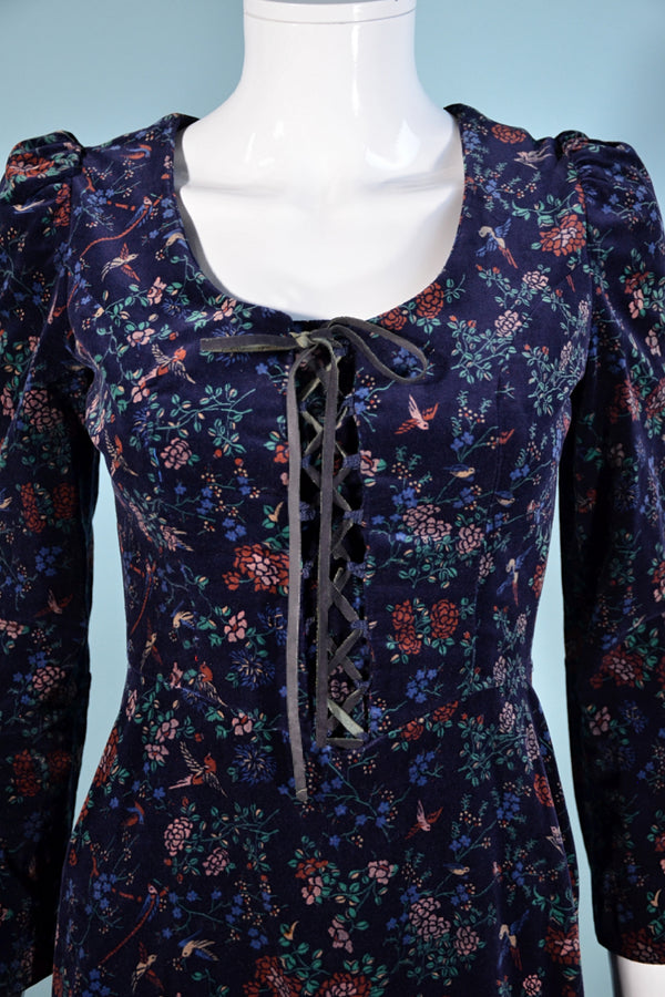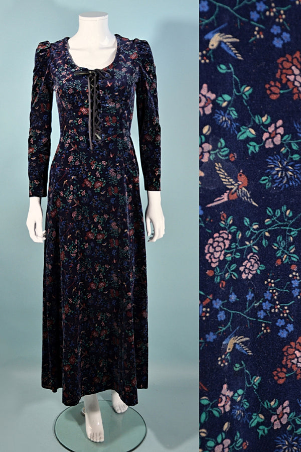 SOLD Vintage 60s/70s Blue Velvet Lace Up Maxi Dress