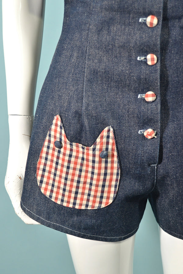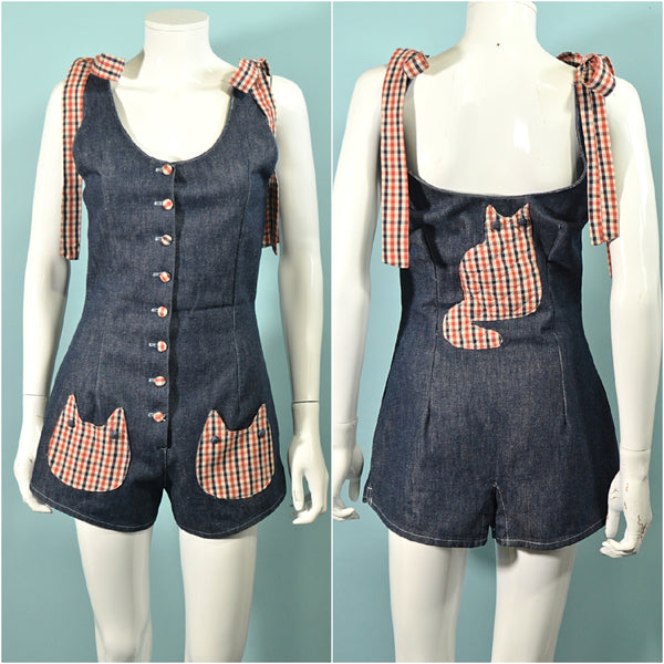 SOLD Vintage 60s/70s Denim Romper Cat Applique S