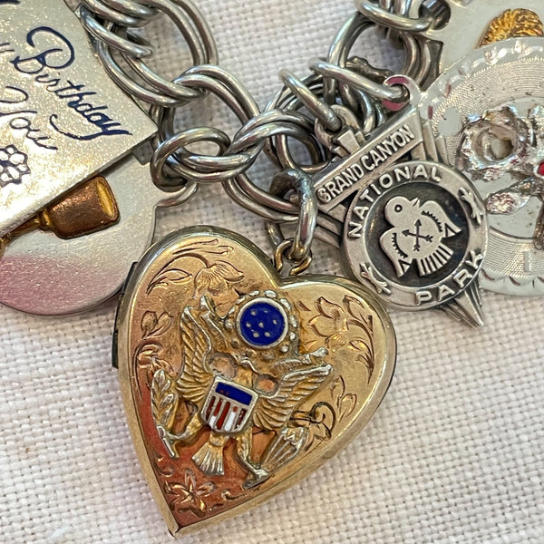 SOLD Vintage 60s Sterling Charm Bracelet, Military Locket Travel Disneyland
