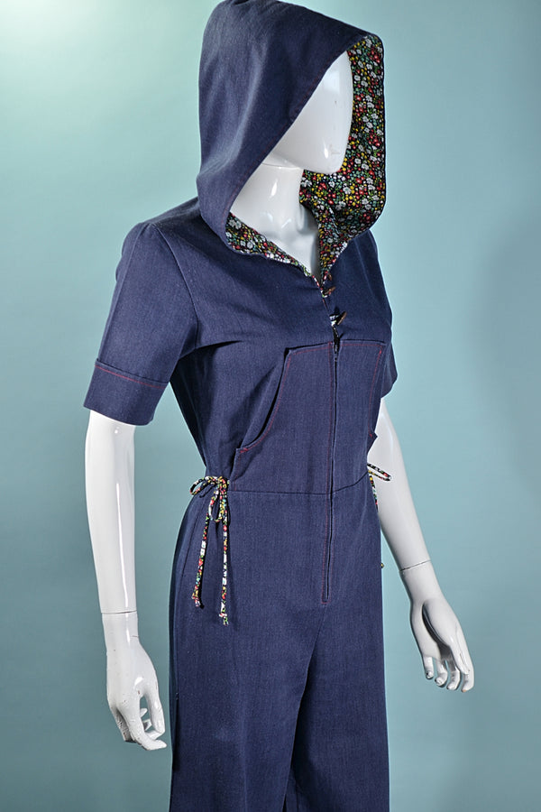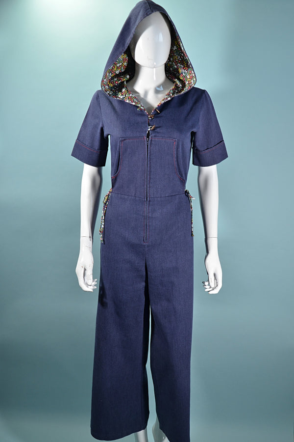 SOLD Vintage 60s/70s Hooded Denim Jumpsuit, Bell Bottoms + Calico Print S