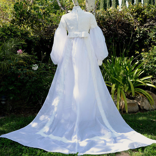 SOLD Vintage 60s White Lace Wedding Gown, Juliette Sleeve Long Detachable Train,Empire Waist XS/S
