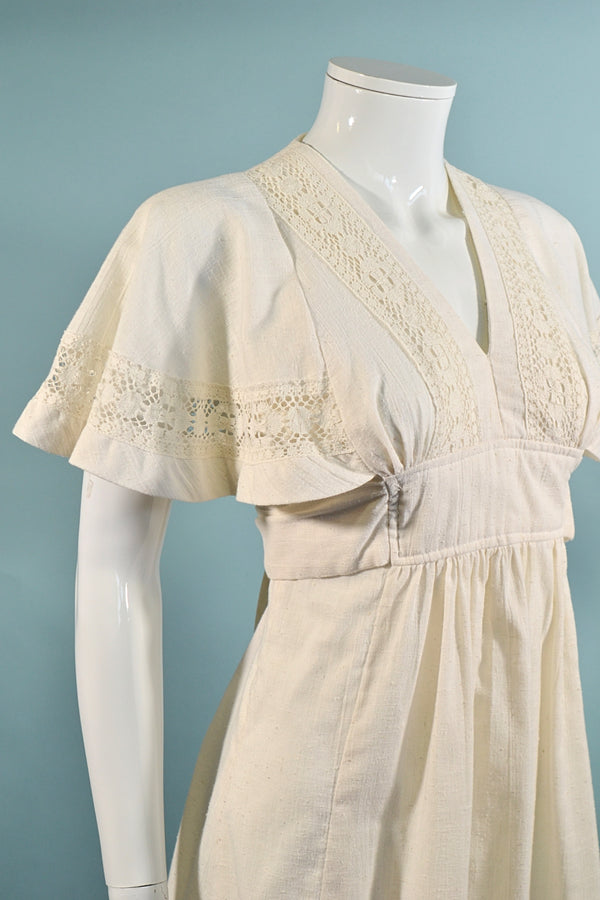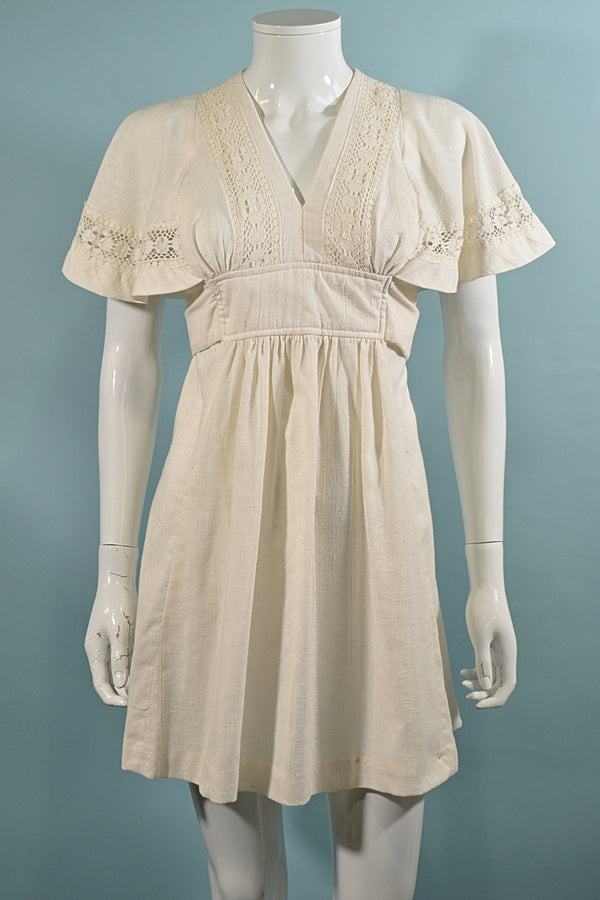 SOLD Vintage 70s Flutter Sleeve Mini Dress, Cottagecore Lace Gauze Mini S