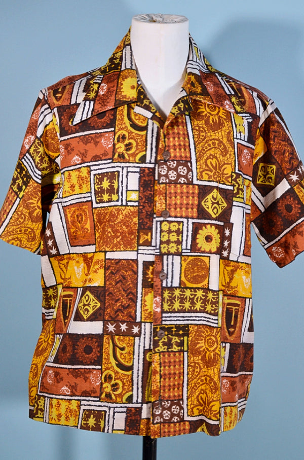 SOLD Vintage 70s Hawaiian Shirt, Cotton Barkcloth Aloha Grandpa Tiki Shirt XL