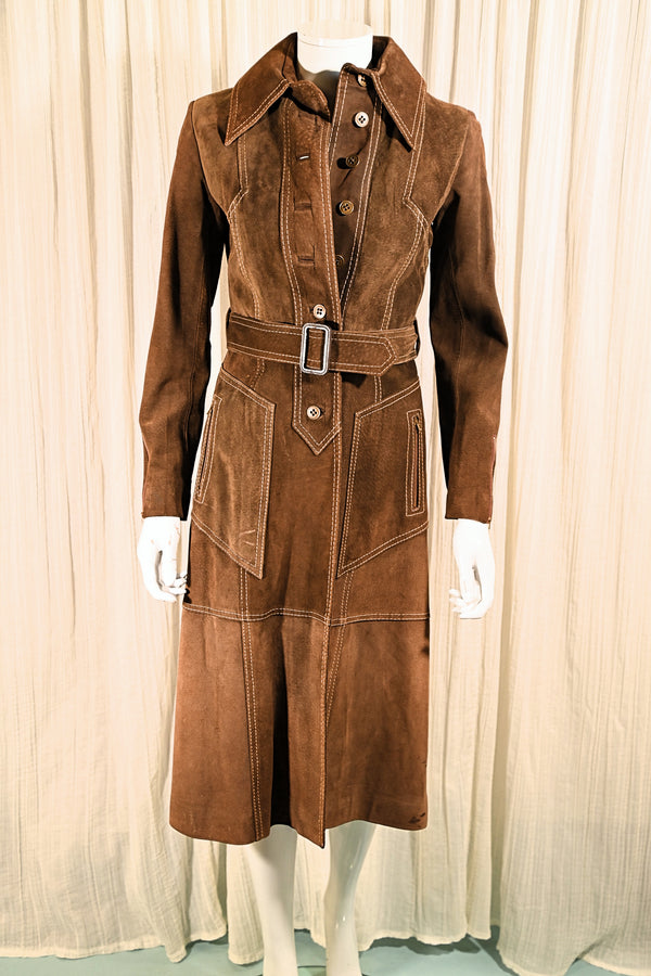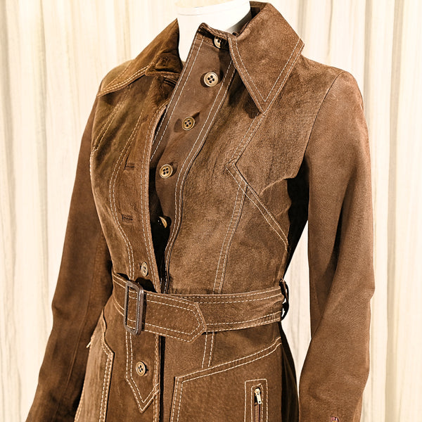 SOLD Vintage 70s Brown Suede Midi Coat, Slim Fitted Overcoat XS