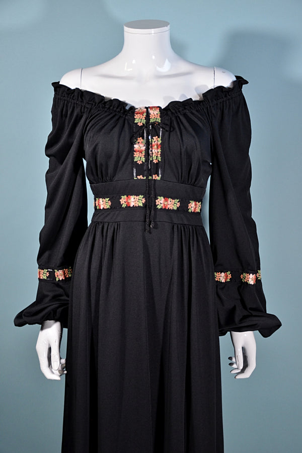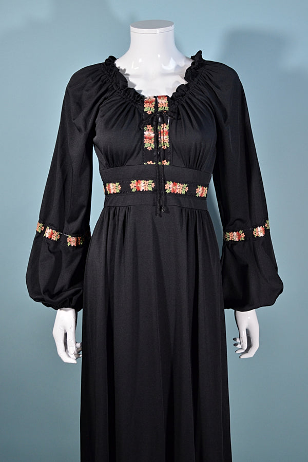 SOLD Vintage 70s Black Hippie Maxi Dress, Floral Accents by Jody of Calif XS/S