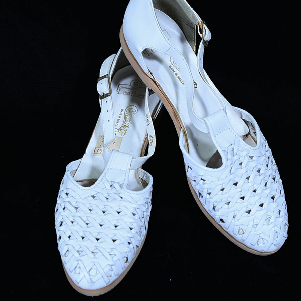 SOLD Vintage 60s/70s White Leather T Strap Shoes, Fisherman Style SZ 9