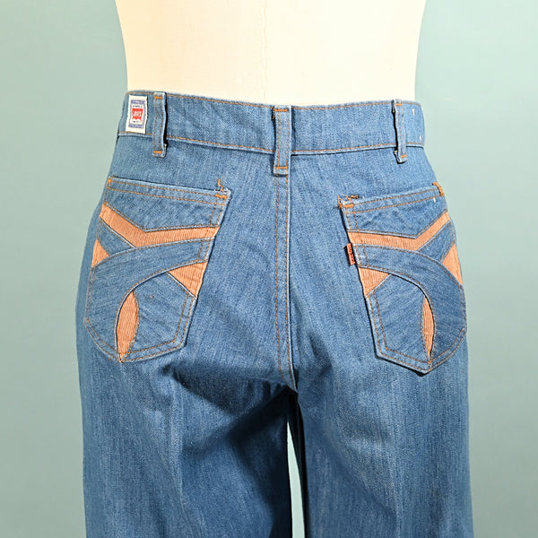 SOLD Vintage 70s Orange Tag Denim Jeans, Light Wash Denim w/Cord Insert Accents