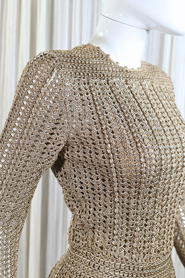 SOLD Vintage 70s Taupe Crochet Dress, Fitted Knit Dress Mady Gerrard XS/S