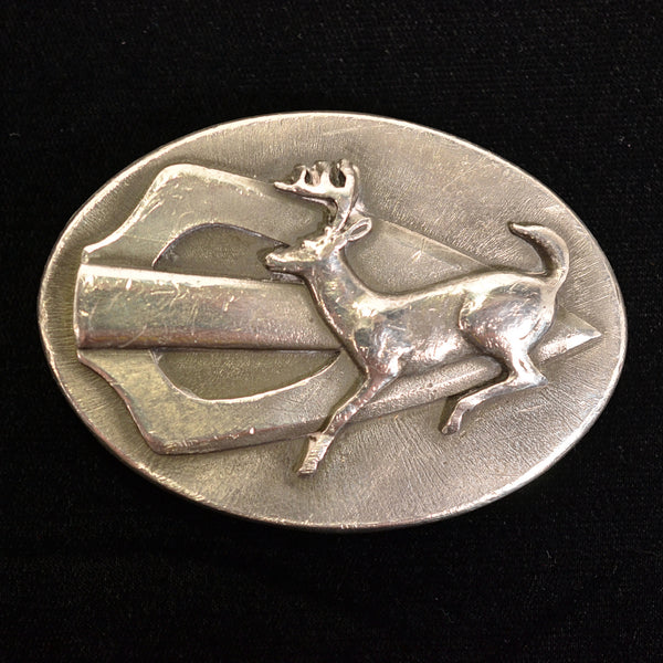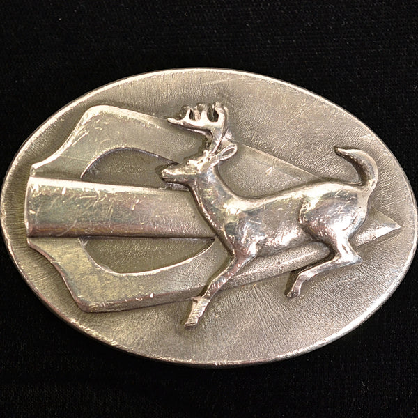 SOLD Vintage 70s Pewter Deer Hunter Belt Buckle, Sid Bell Design Pilgrim