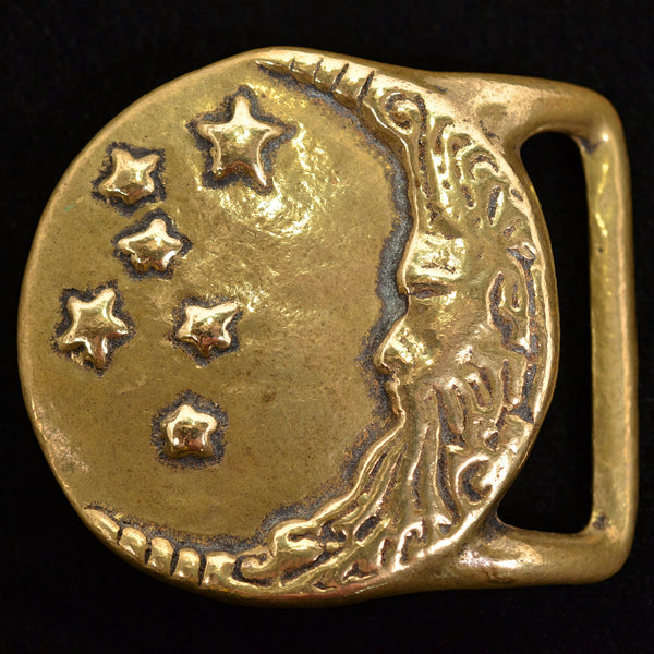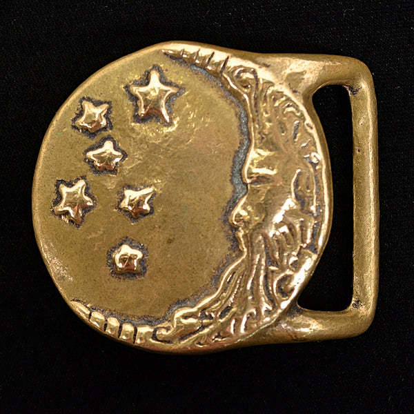 SOLD Vintage 70s Man in The Moon Belt Buckle, Solid Brass Celestial Stars Hippie Buckle, Trinty 119.9 Grams