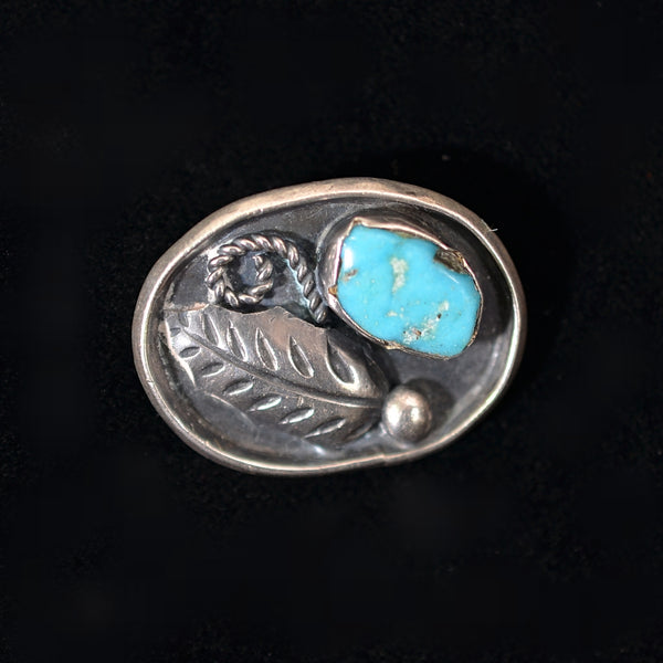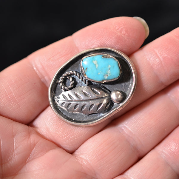 Vintage 70s Signed Platero Navajo Old Pawn Sterling Turquoise Brooch, Leaf Pattern