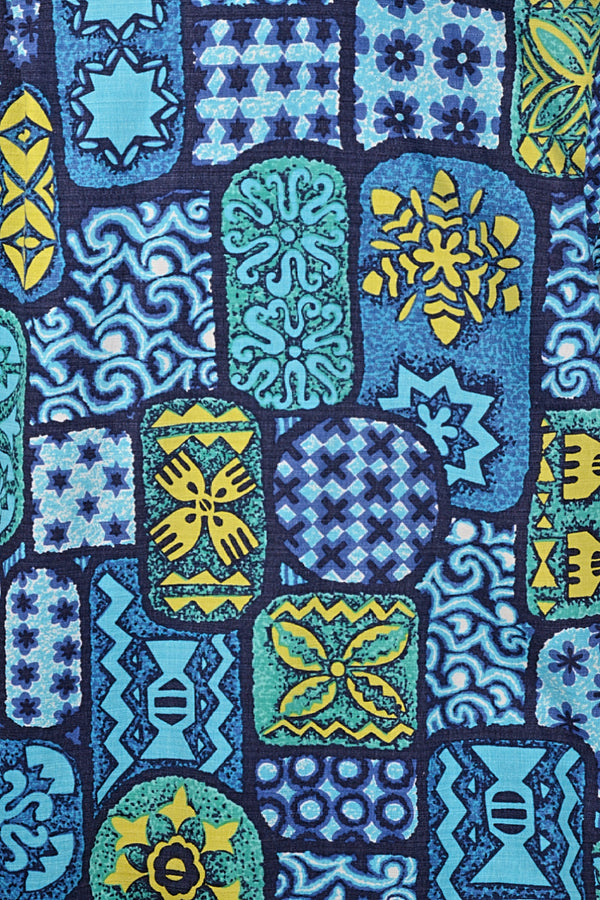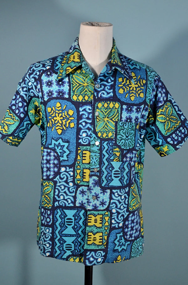 Vintage Hawaiian Shirt 60s/70s Polynesian Print, Cotton Barkcloth Aloha Shirt