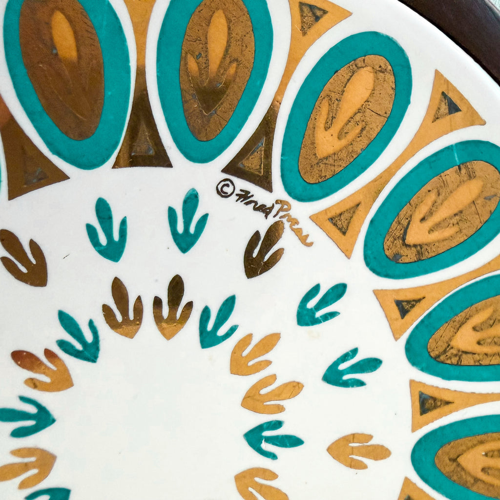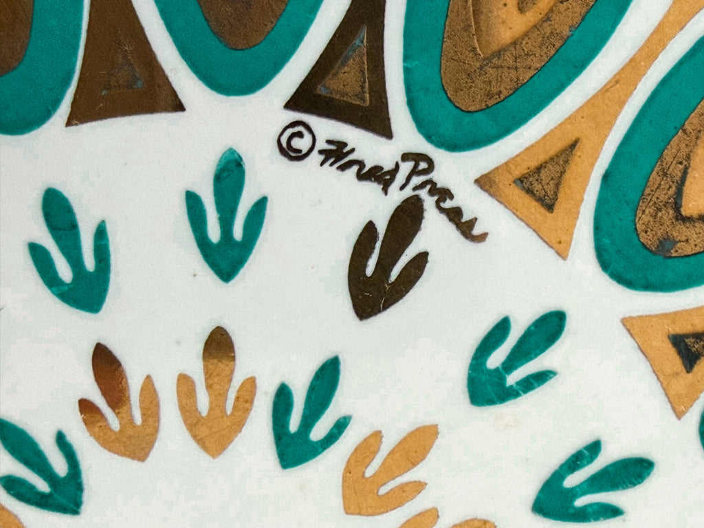 Atomic style, white tile with aqua, shiny & matt gold details.