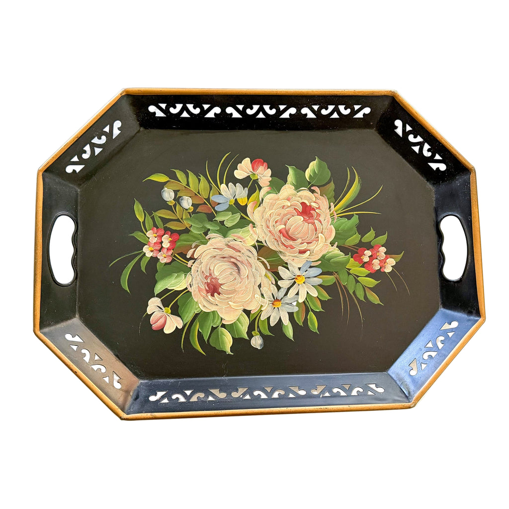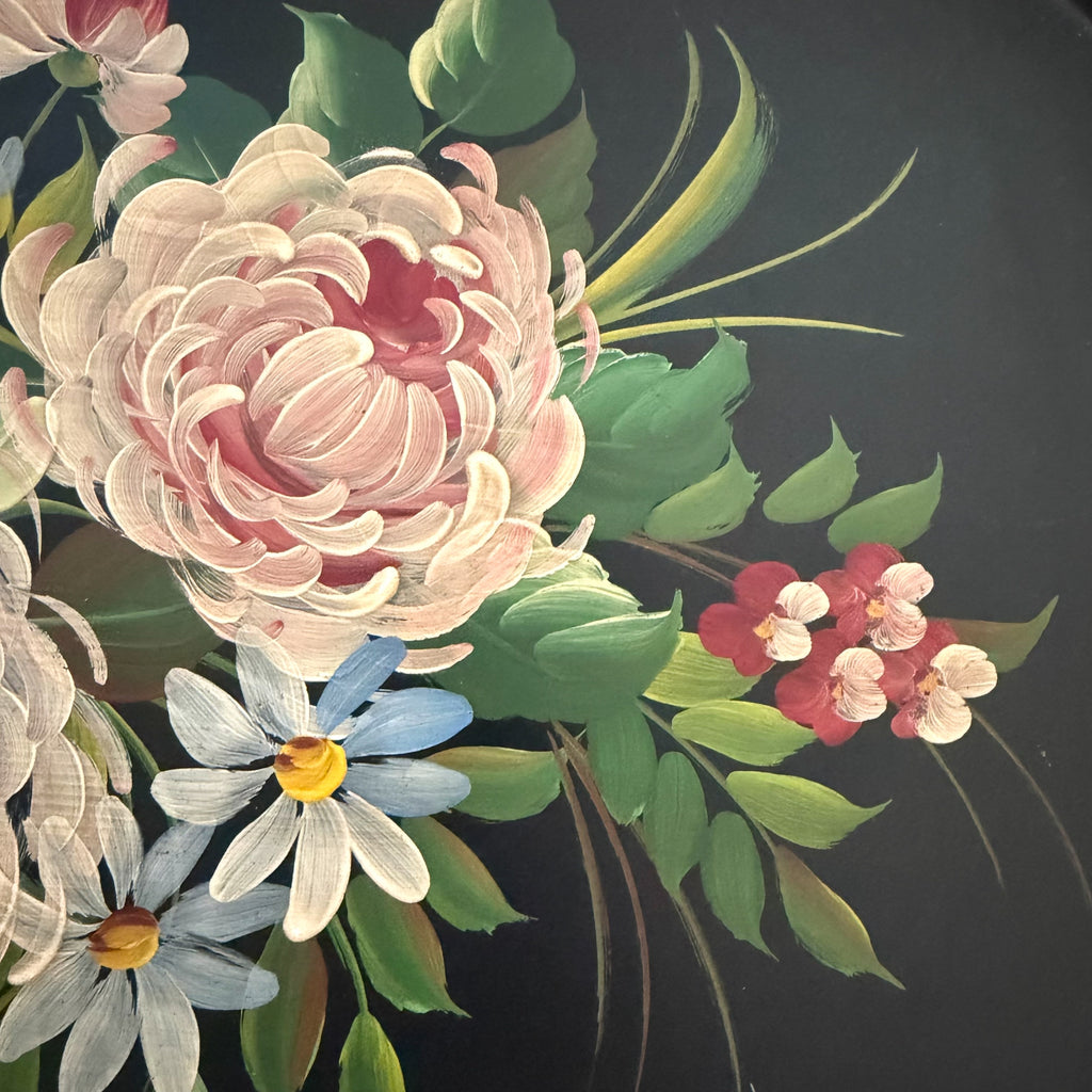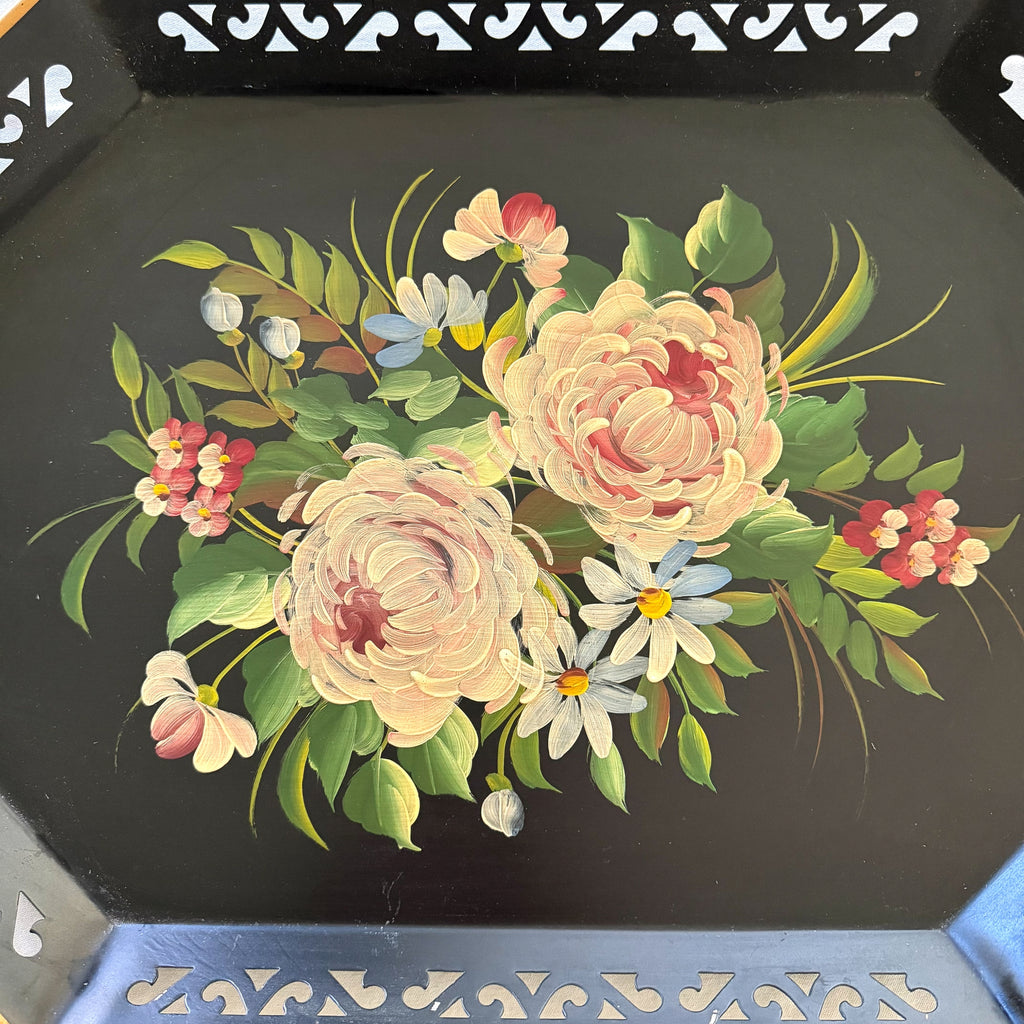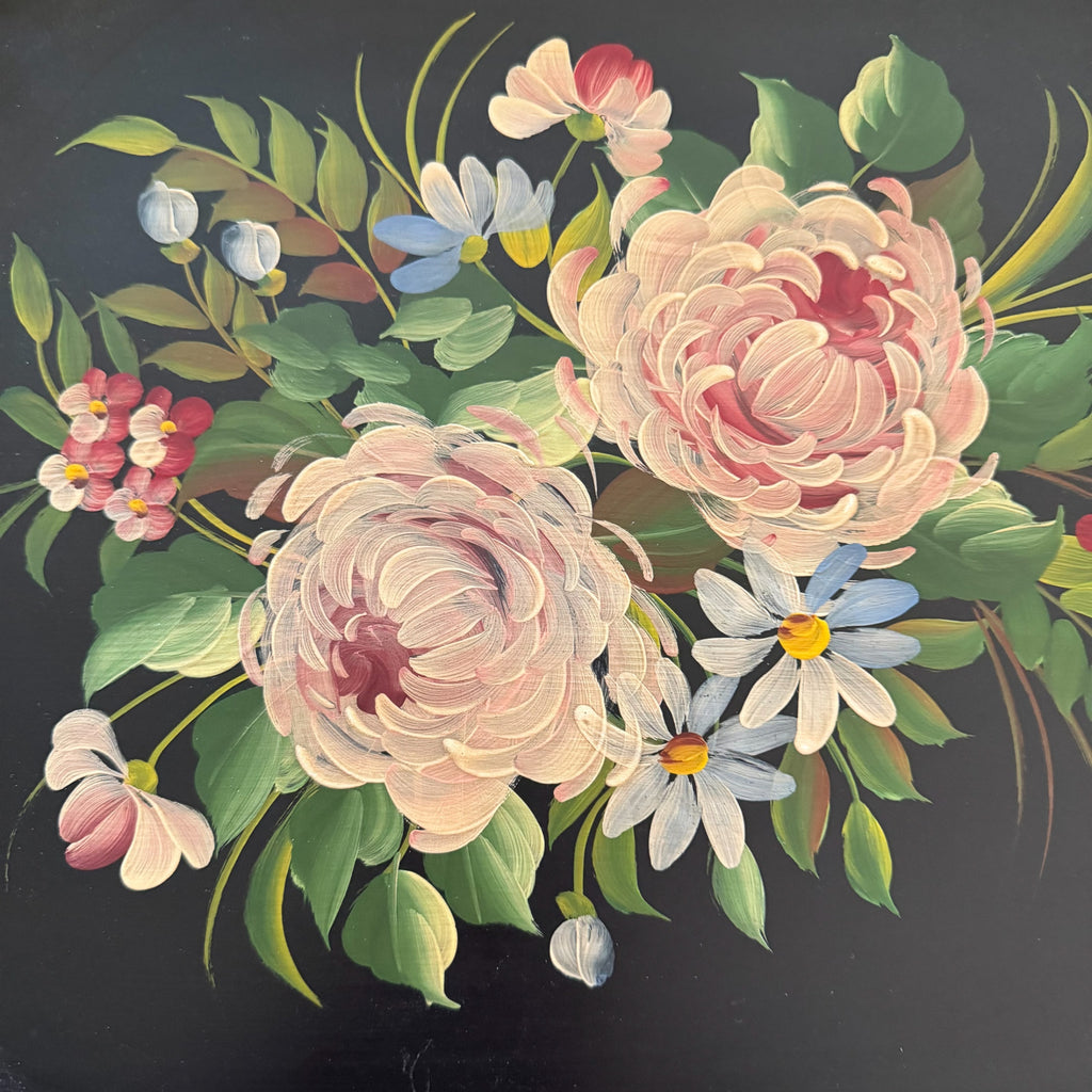 Black tray accented with gold details and full lovely flowers in pinks and multi-colors.