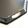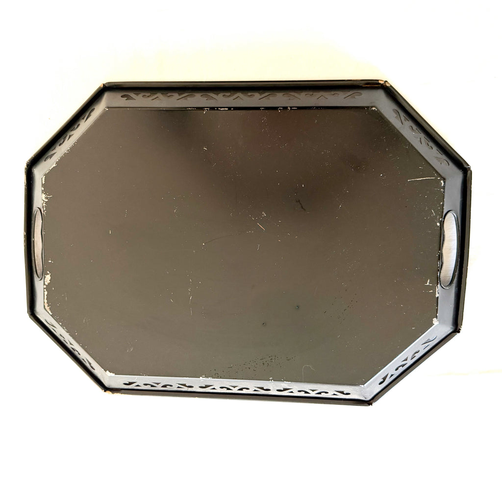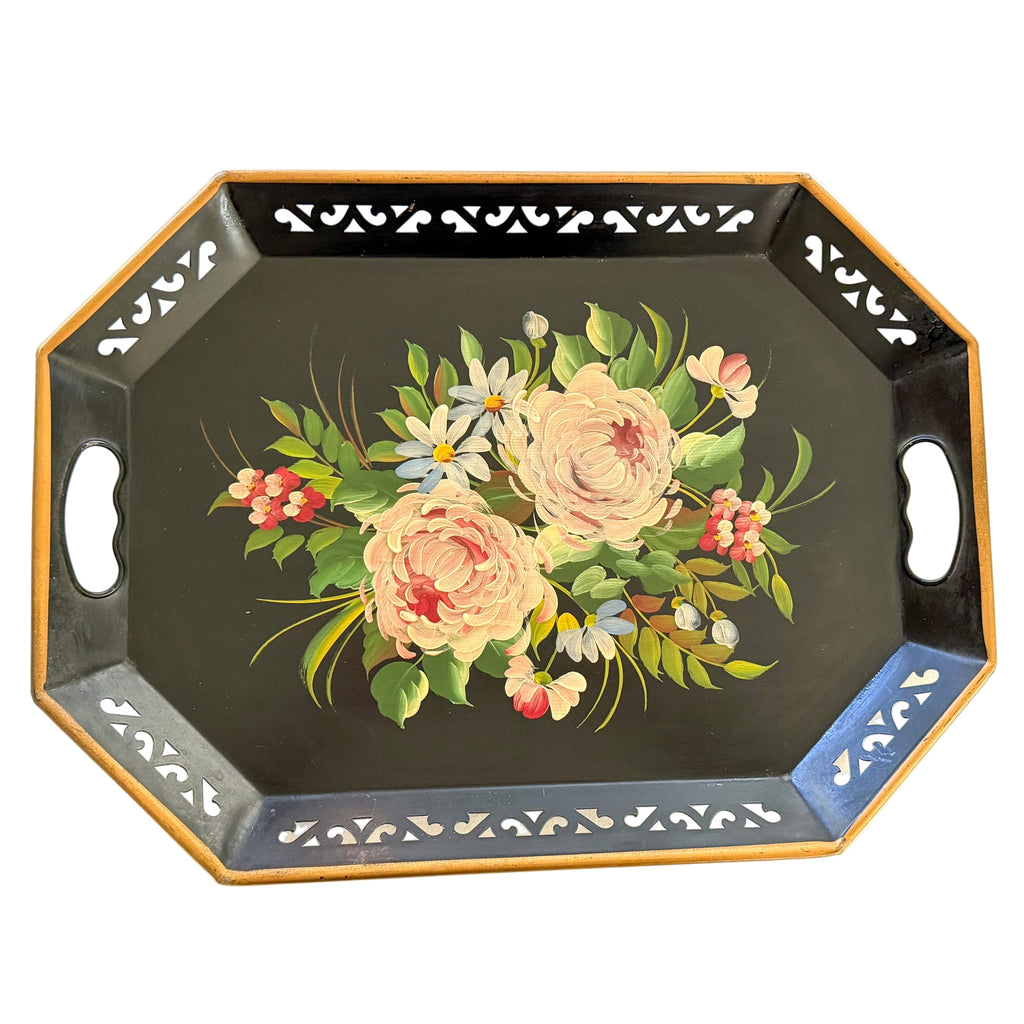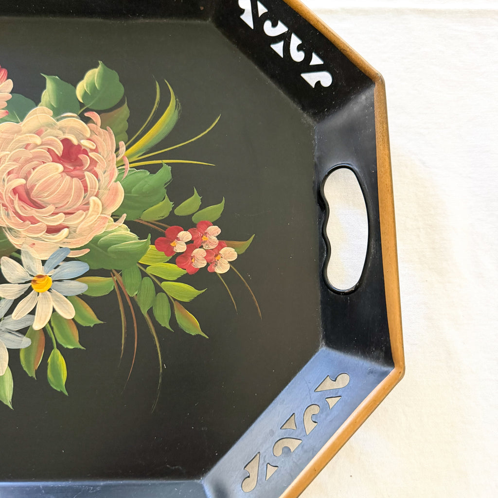 Black tray accented with gold details and full lovely flowers in pinks and multi-colors.