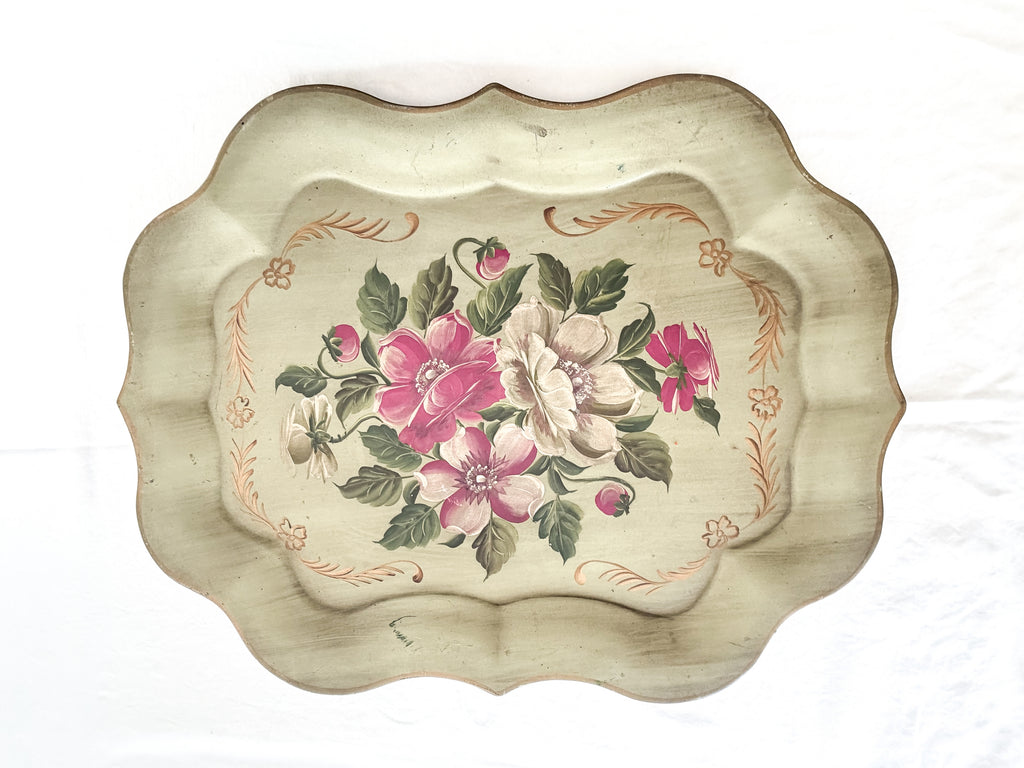 Celery/sage green tray accented with gold details and full lovely flowers in pink, maroon and taupe. Antiqued brushed finish. *It was difficult to show the accurate color in photos.
