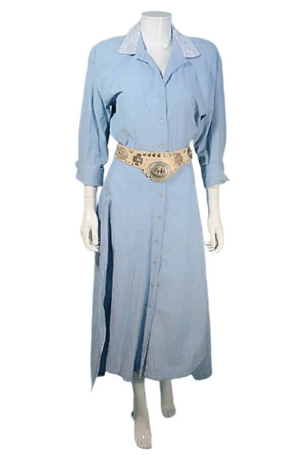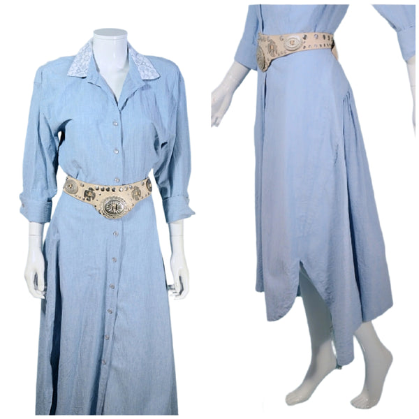Vintage 80s Blue Chambray Dress, French Cuff & Lace Details S