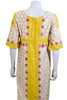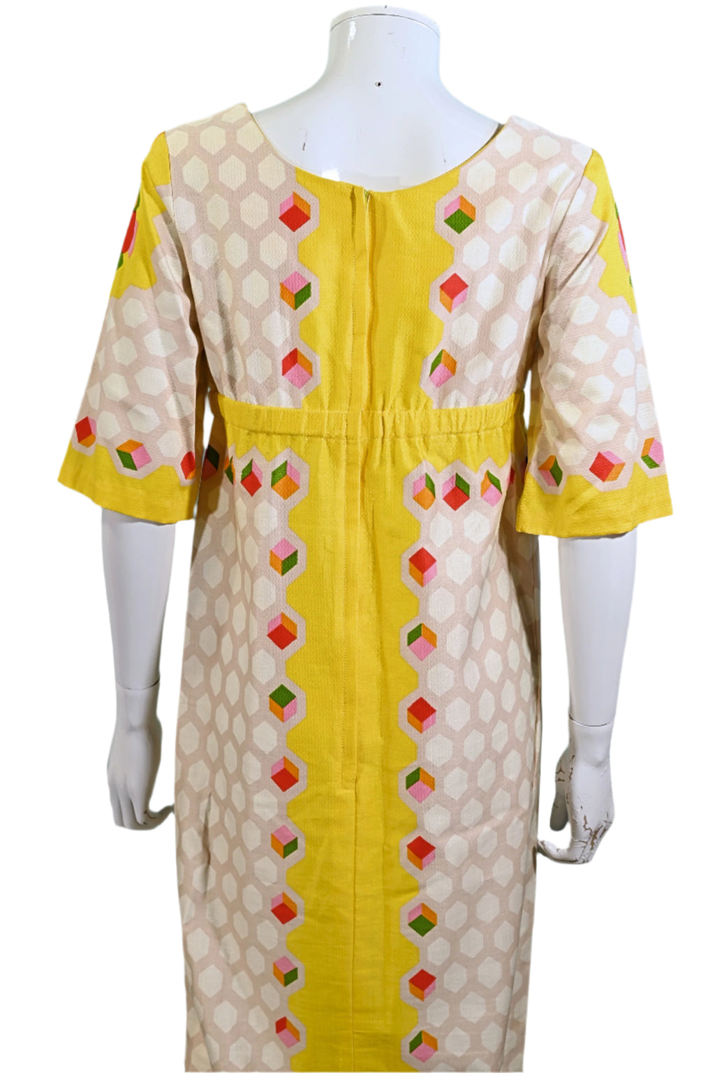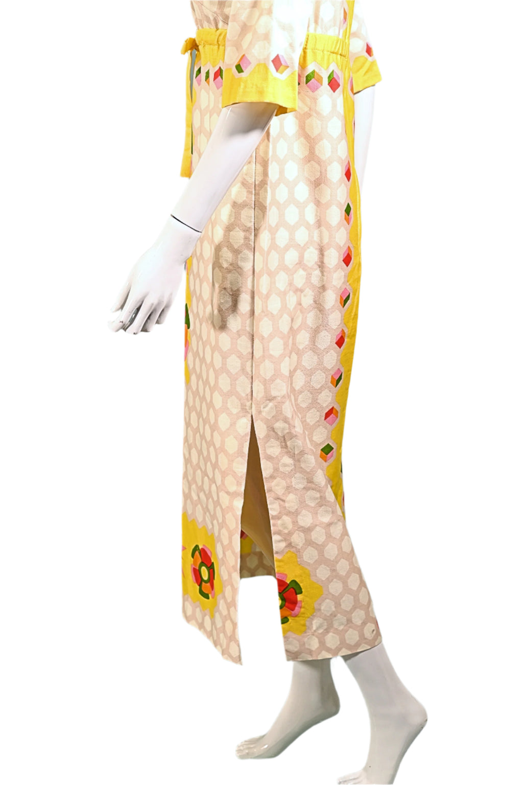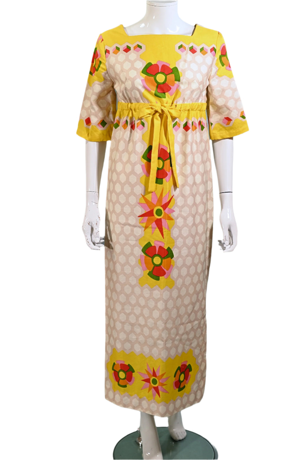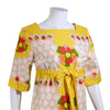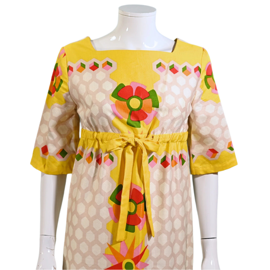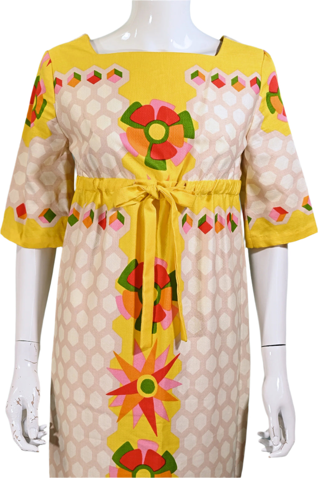 Short sleeves, adjustable empire waist, with sash belt the ties into a bow.