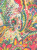 Cream, deep reddish pink, blue, green, yellow paisley print.