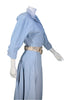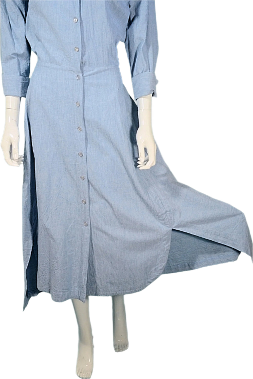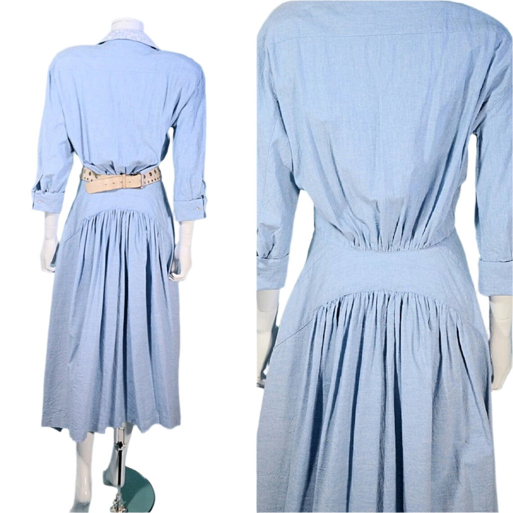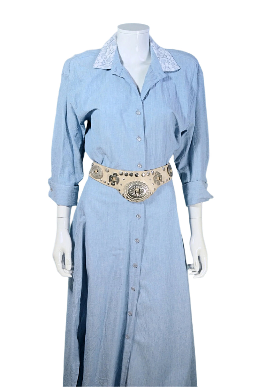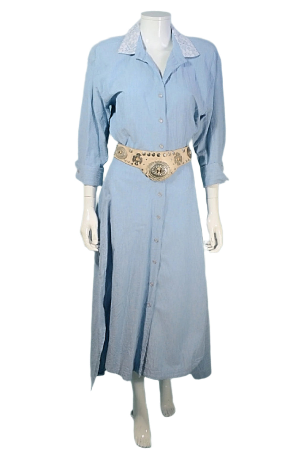 Vintage 80s chambray/oxford cloth blue cotton dress with lace collar.
