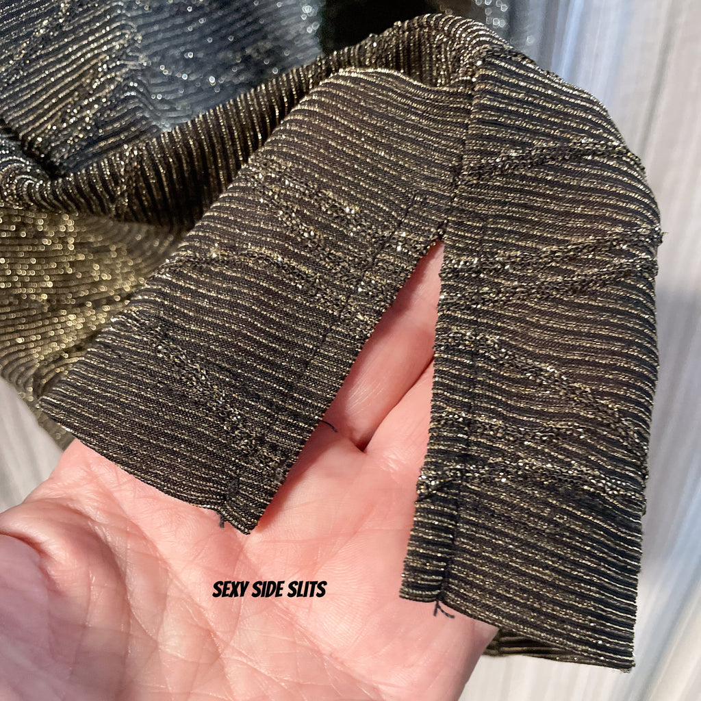 Sparkle knit fabric with swirly pattern, black lining. Metallic gold/black (Bronze), black undertones, black lining.