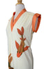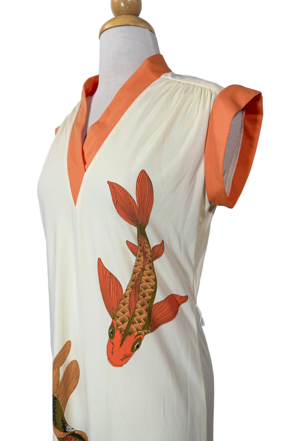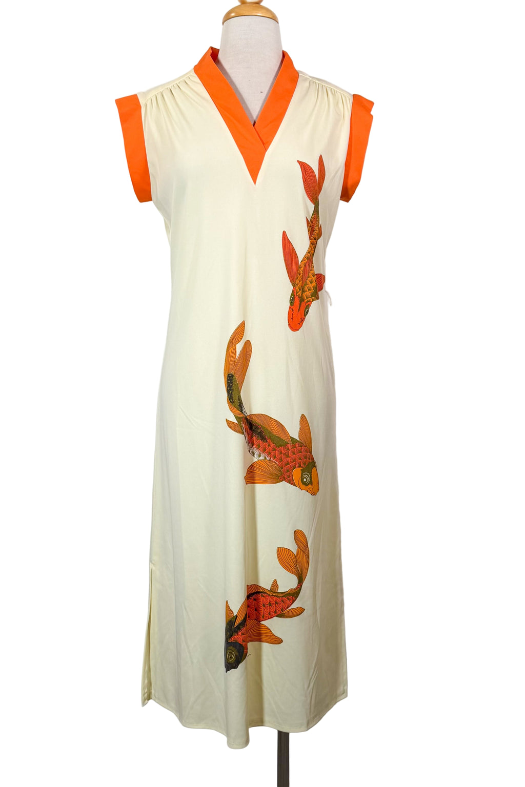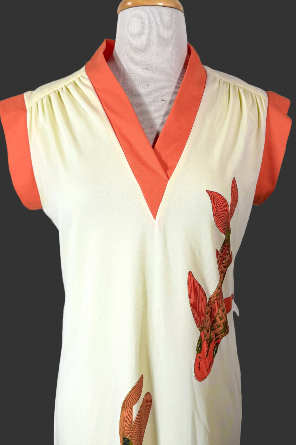 Vintage Alfred Shaheen dress with V neck, cap sleeves and swimming koi fish.