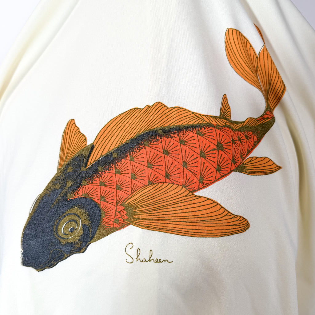 Palest yellow color with bright orange accents. Koi fish orange tones. Metallic gold accents have faded.