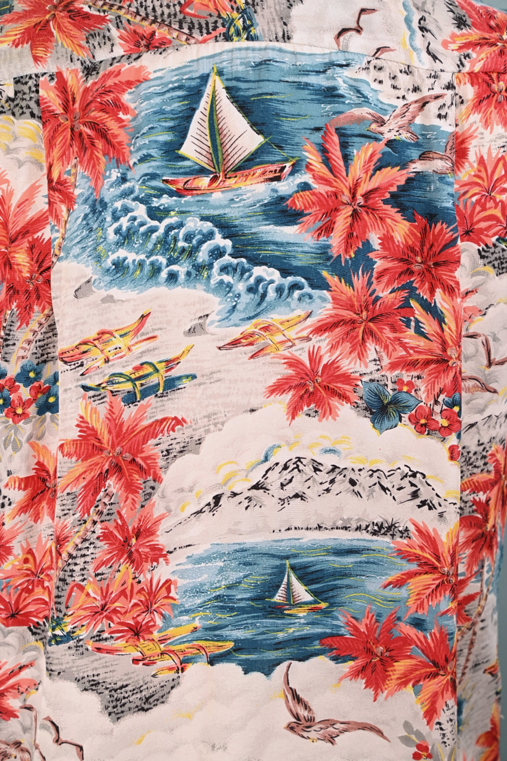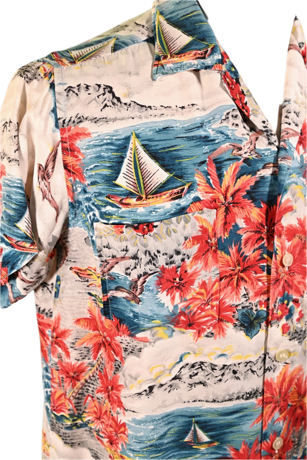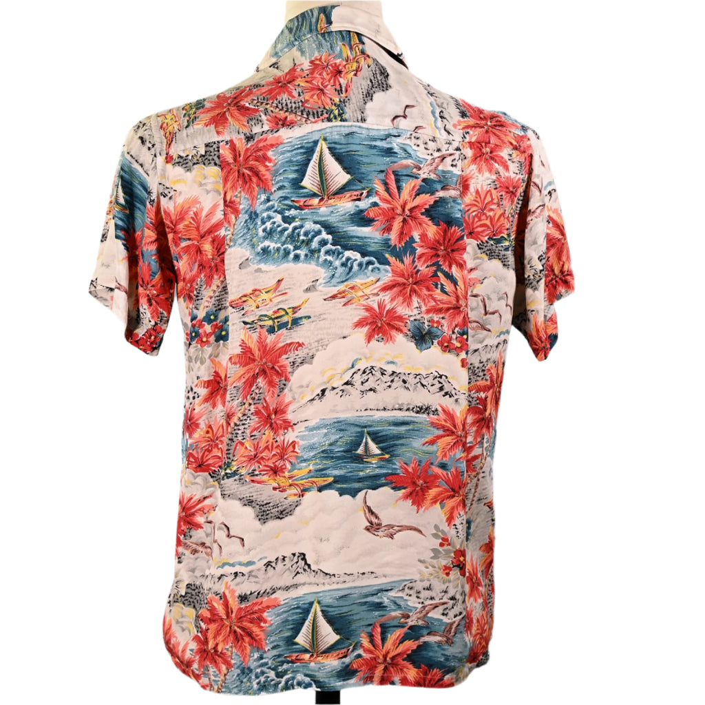 Made in Japan Aloha shirt with mountains, ocean, boats, palm trees.