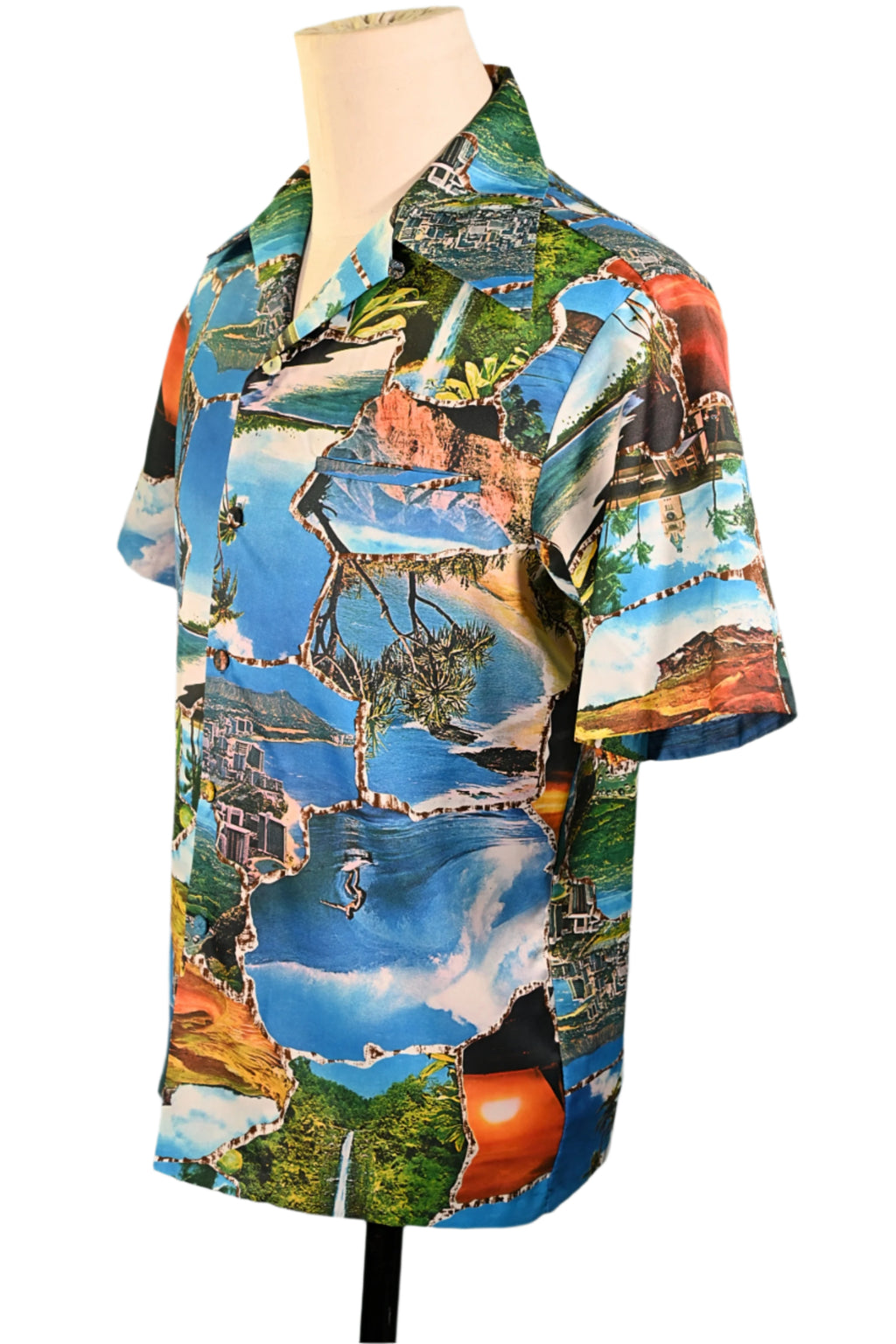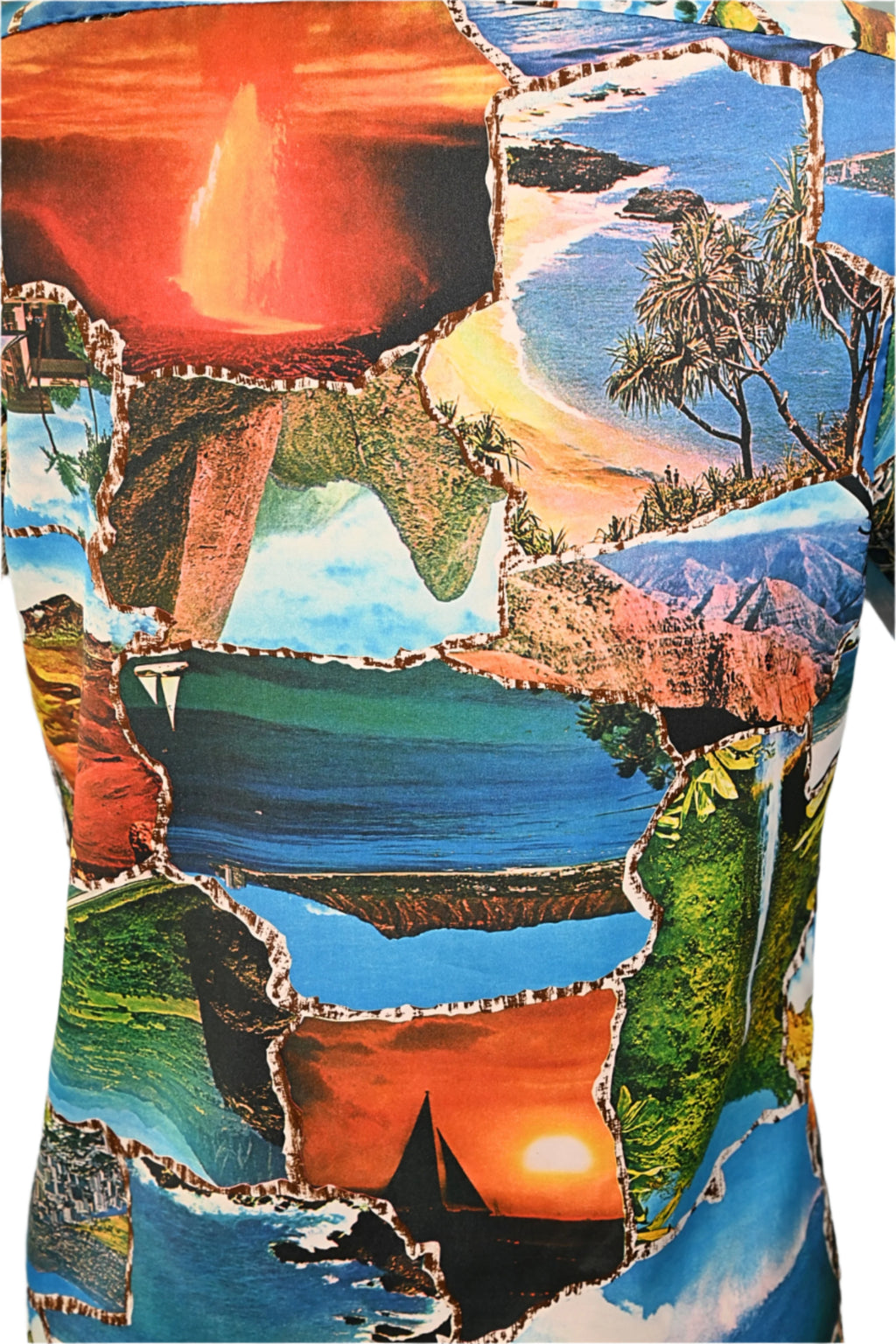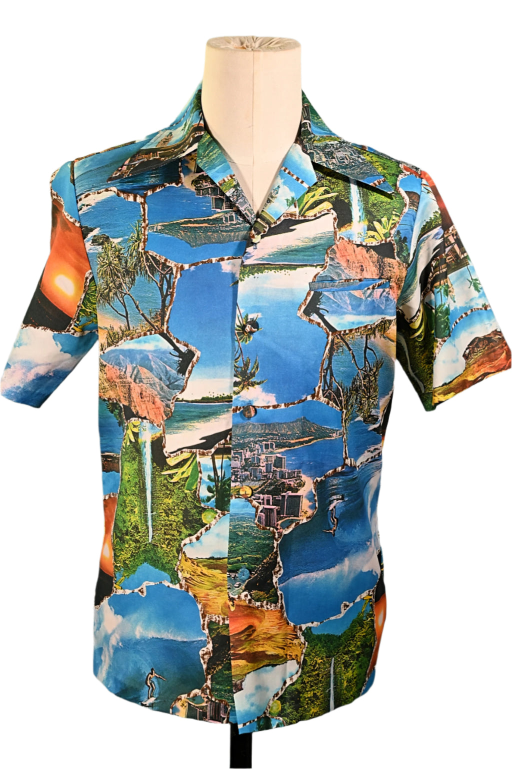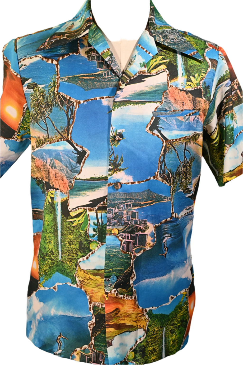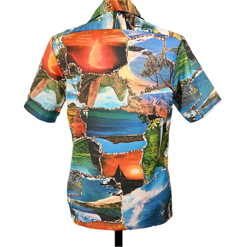 Vintage 70s photo image shirt showing images of Hawaii including waterfalls, volcanoes, surfers and more.