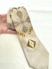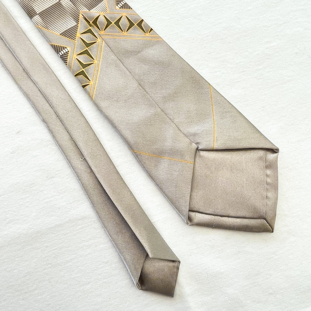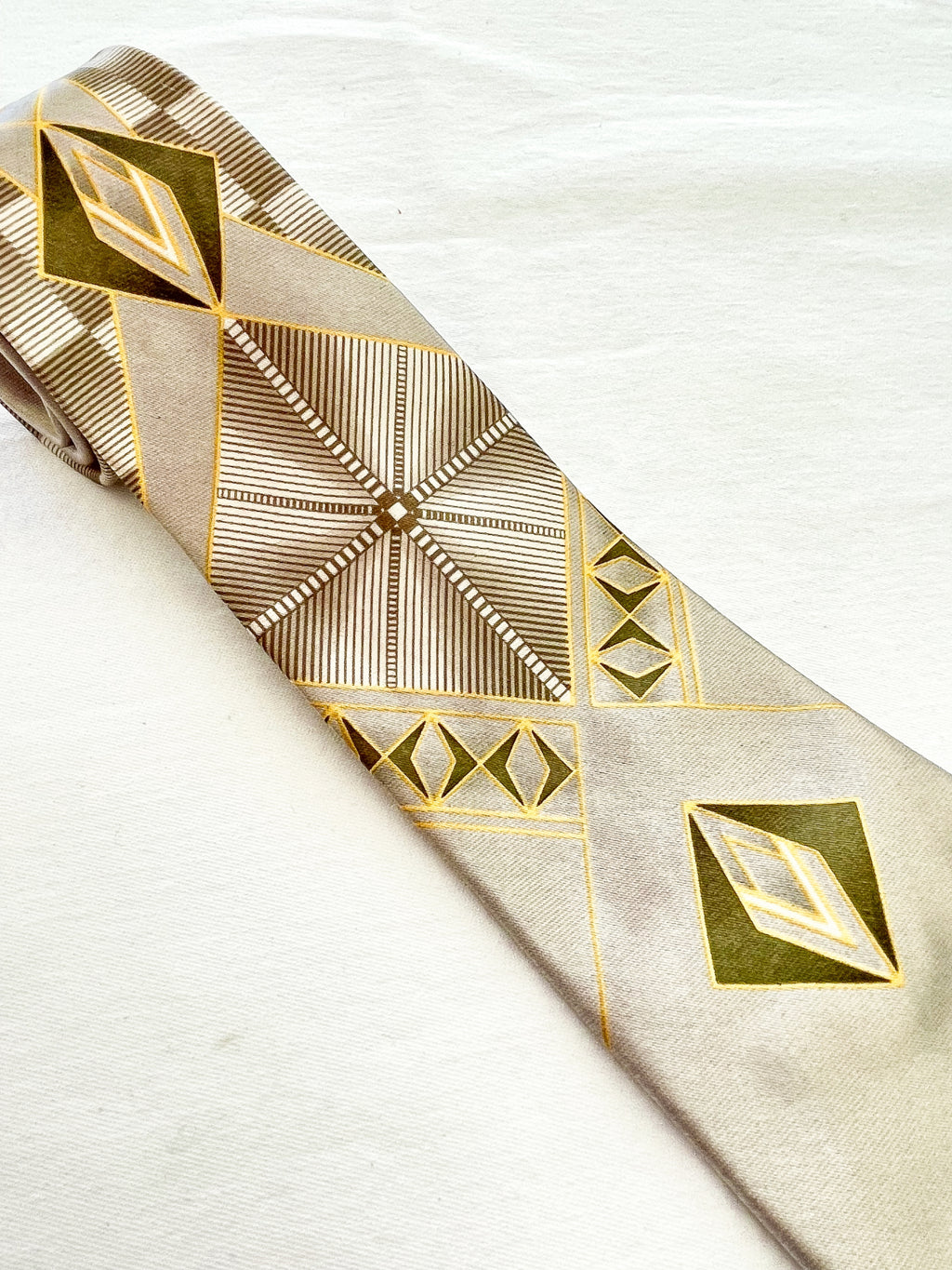 Taupe ground color, yellow brown & deep green accent colors. *The colors were very hard to adjust the tie is not grey it is taupe, the triangles are deep avocado green, yellow & brown details.