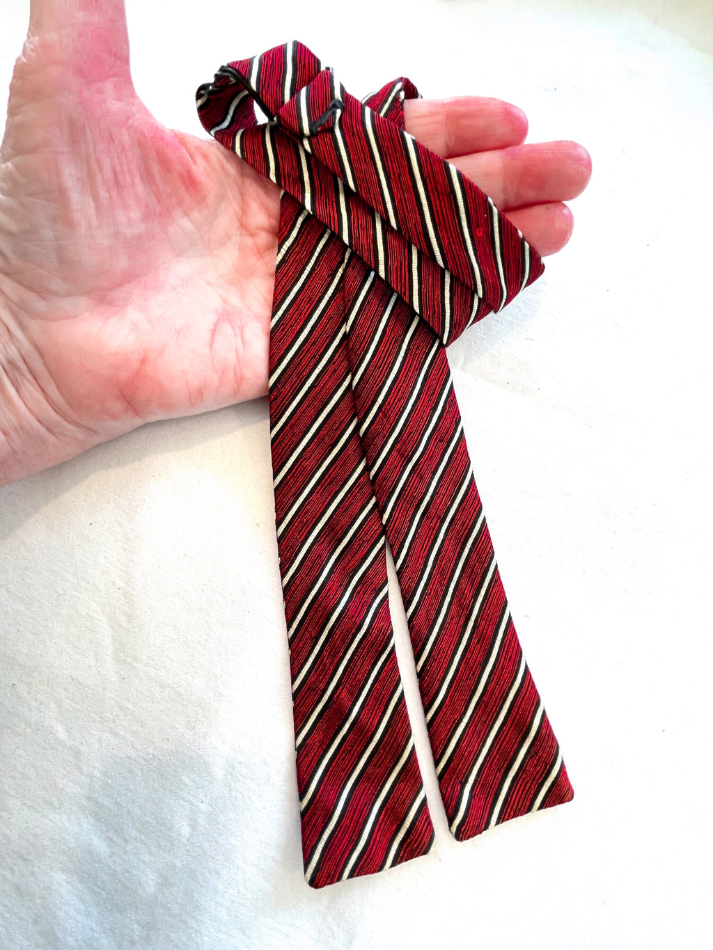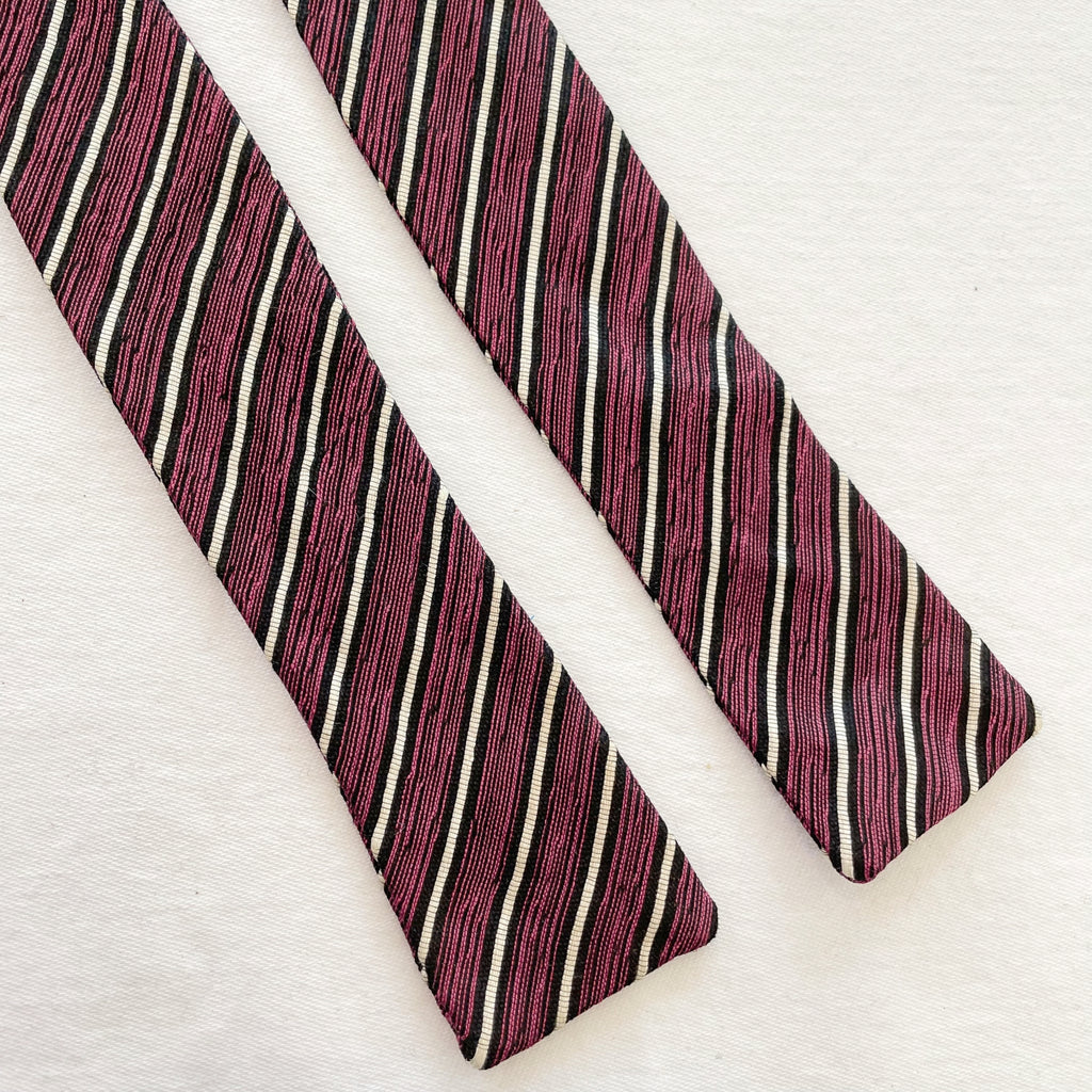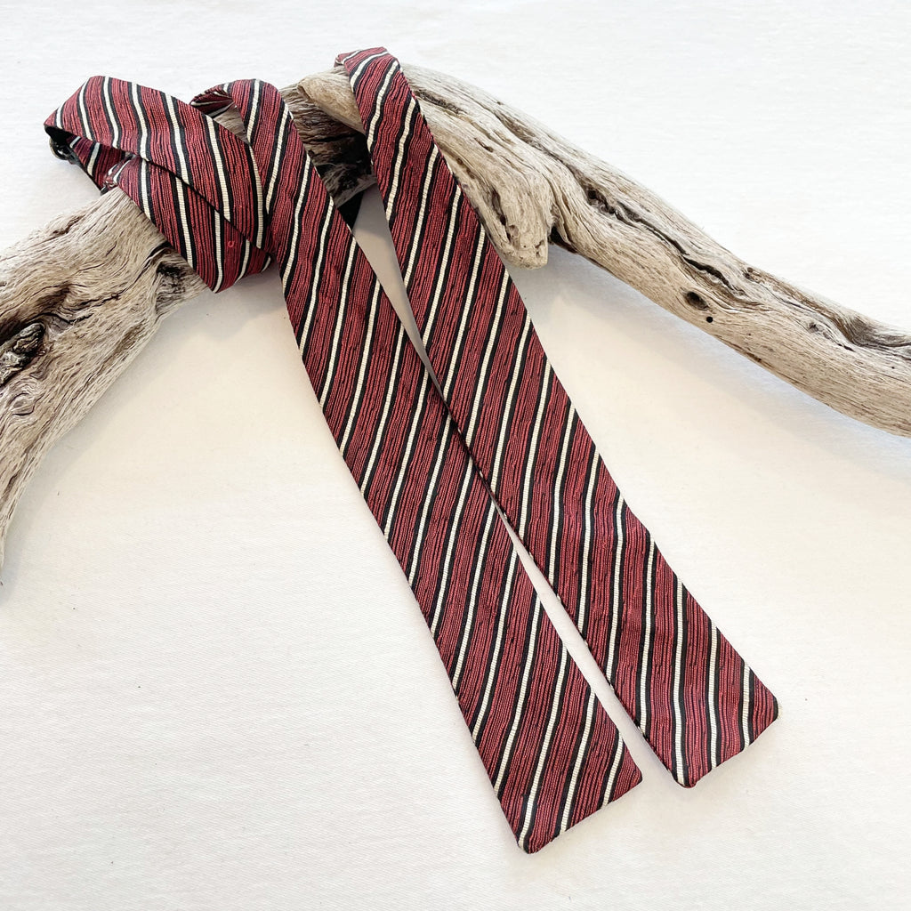 Vintage MCM red, black, white diagonal striped bowtie, tiny, striated stripes.